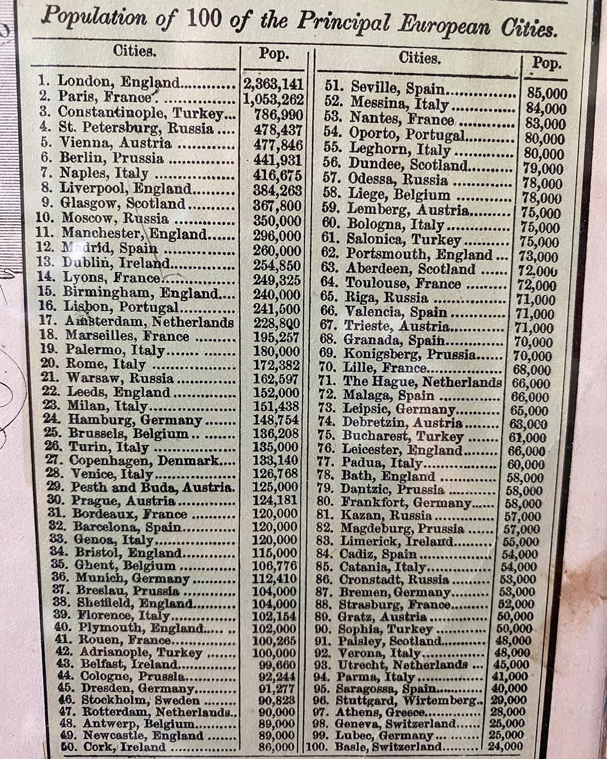 Londra'nın nüfus olarak bu kadar fark atmasına şaşırdım. Diğer İngiltere şehirleri de listede üst sıralarda. İngiltere nüfus olarak açık ara fark atması ilginç. Dönemin Hindistan'ı gibi bir şeymiş.