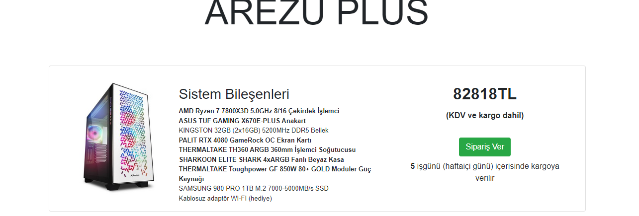 | Inventus'ta bu sistem fena değil. Ekran kartını Rtx 4090 yapınca 105000 TL civarına denk geliyor. Aynı şekilde işlemciyi i7 14700KF, anakartı ise Asus Tuf Z790 Plus yapınca da aynı fiyata denk geliyor. Yalnız, Sharkoon işlemci soğutucusunu tedarik edilemiyor olarak göstermekte. |