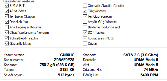 Harddisk Kapasitesi : 750 GB
