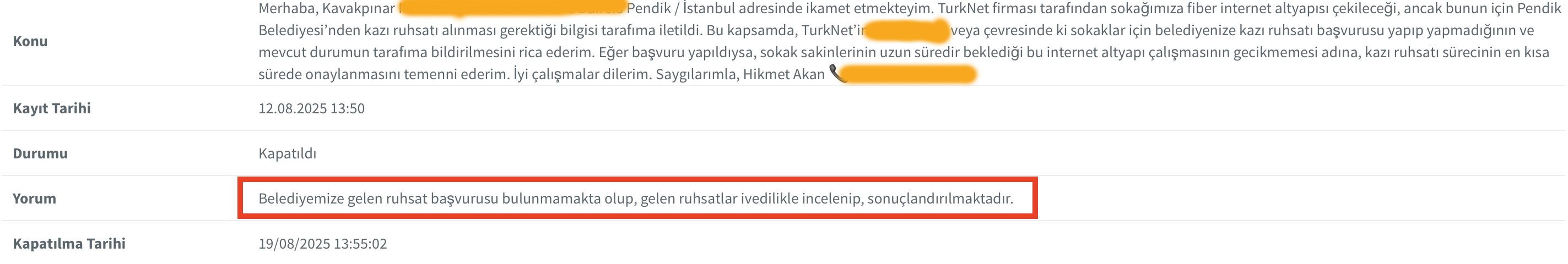 Pazarlama ekibinden Tayfun Bey iletişime geçti. Altyapı ekibiyle iletişime geçip sürecin neden ilerlemediği hakkında bilgi alacak. Belediye kazı izni v.s gibi durumlar olduğunu düşünmüyorum çünkü belediye tam tersi destek oluyor. Ağustos ayında gelen ekipten Levent Bey kazı izni alamadık demişti o gün belediye ile iletişime geçtim verdikleri cevap aşağıdadır.