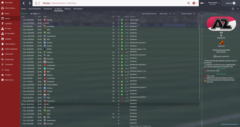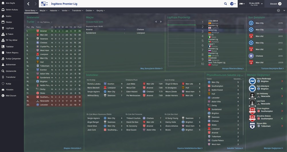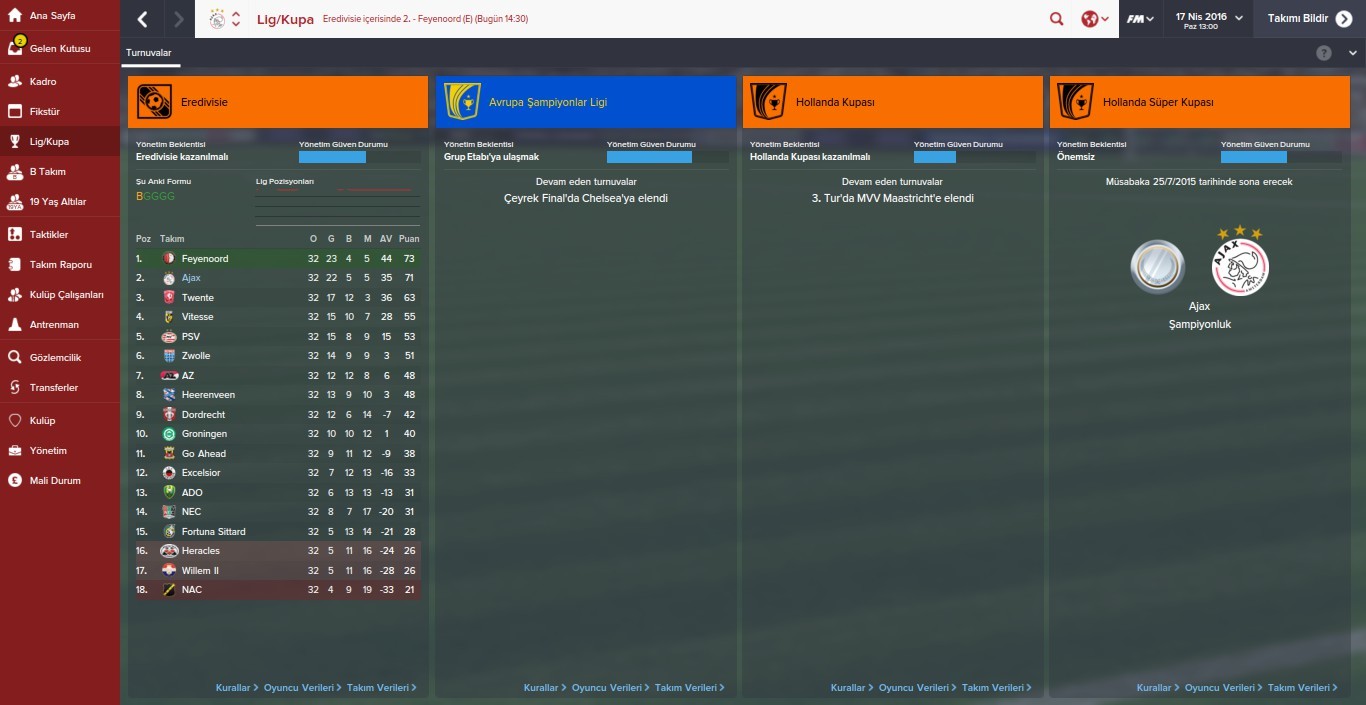 Ve 2015/2016 sezonu başladı. Oynadığımız 15 maç sonunda hem ligde, hem şampiyonlar liginde fırtına gibi esiyoruz. Ligde Ş.ligi rotasyonu sebebiyle kaybettiğimiz Vitesse ve Nec maçı haricinde yenilgisiz gidiyoruz. Takım ligin çok üzerinde. Şampiyonlar liginde ise beklentimizin çok üzerindeyiz. Gücümüze uygun bir grup. 2.lik hedefiyle başlamamıza rağmen liderliği oynayacağız gibi gözüküyor. Ancak leverkusen ve psg deplasmanlar da bizi bekliyor. < Resime gitmek için tıklayın > 2-0 dan 4-2 kazandığımız efsana Psg maçı. < Resime gitmek için tıklayın > Bu maçlar sonucunda puan tabloları < Resime gitmek için tıklayın > Oyuncu performansları < Resime gitmek için tıklayın > Özellikle 14 maçta 11 gol 16 asist ile oynayan Salvio ve 13 maçta 15 gol atan Barbosa takımı sırtlıyorlar. |
