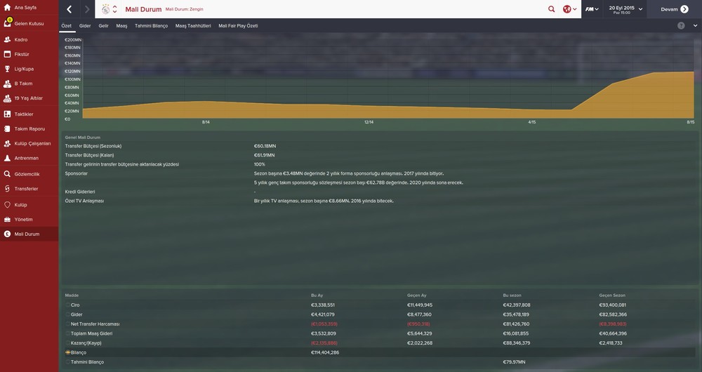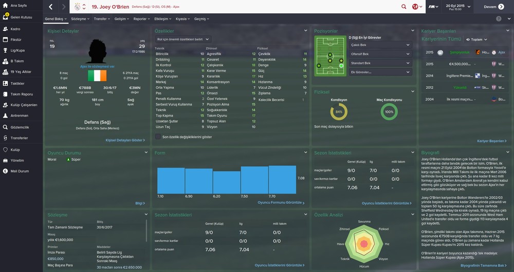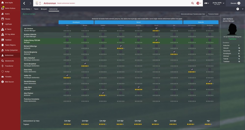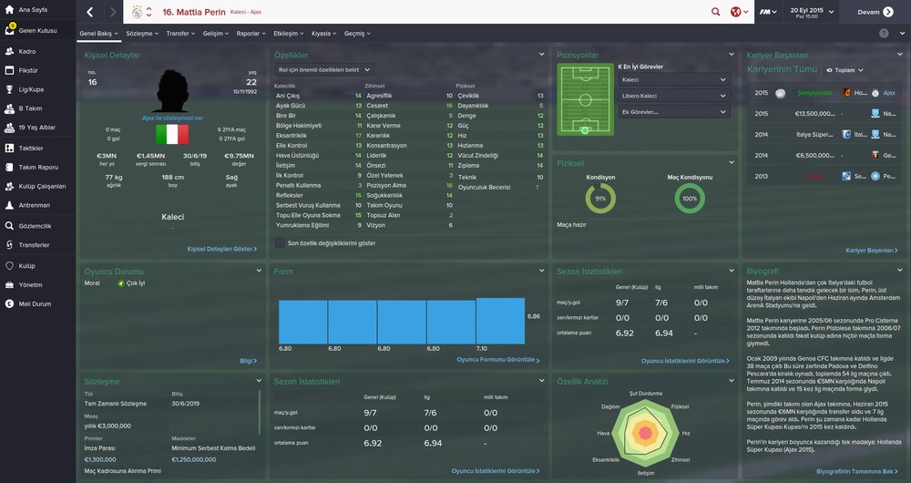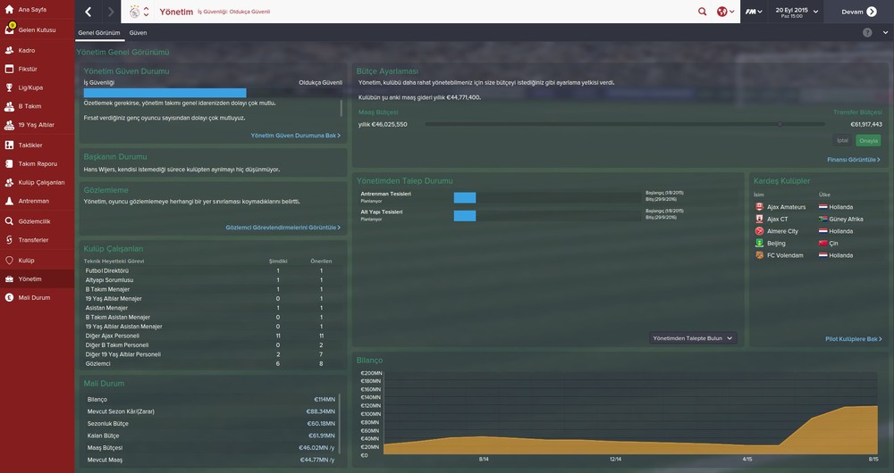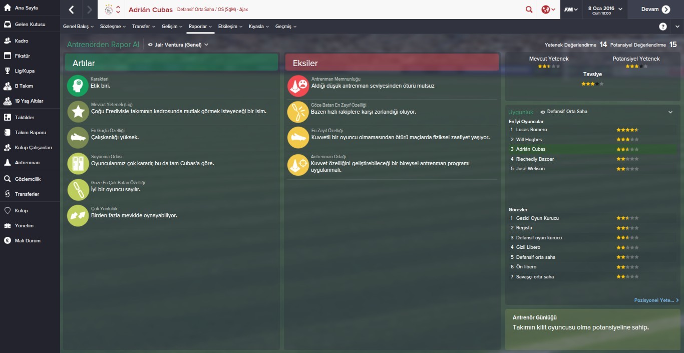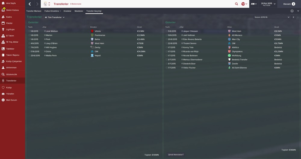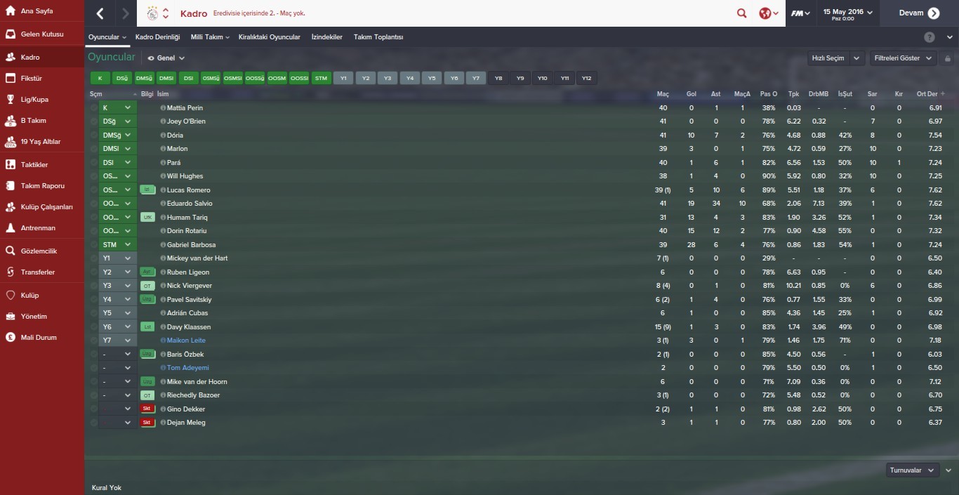 2015/2016 sezonunda transferin en hareketli takımı olduk. < Resime gitmek için tıklayın > savunmanın yıldızı alvarez balantayı tam 50 milyon euroya manchester citye gönderdik. Böyle bir niyetimiz yoktu fakat teklif çok iyiydi. Ancak en az onun kadar iyi bir ismi de kadromuza kattık. Doria < Resime gitmek için tıklayın > Jasper Cillessen yerine geleceğin en büyük kalecilerinden Mattia Perrini bitirdik. < Resime gitmek için tıklayın > Kaptanlığı alındıktan sonra sürekli problem çıkartan Ricardo van Rijhine de tolerans göstermeyerek gönderdik ve Tecrübesine güvendiğimiz Joey O'brien i gayet iyi bir paraya aldık. < Resime gitmek için tıklayın > Ve orta sahada lucas romeronun partneri olarak yeni Gerrard Will Hughes. < Resime gitmek için tıklayın > Neredeyse tüm maçlarını takip ettiğim Güney Amerika 19y Şampiyonası bu sezonun transferlerini de şekillendirdi. Bu kupada keşfettiğimiz oyuncular Veltmanın yerine gelen Marlon < Resime gitmek için tıklayın > Jose Wellson < Resime gitmek için tıklayın > Boliesenin yerine kupanın yıldızlarından sol bek Para < Resime gitmek için tıklayın > Bu sezon düşündüğümüz ilk 11 ve taktiğimiz. < Resime gitmek için tıklayın > Bu da yedeklerden kurulı 2. takımımız. < Resime gitmek için tıklayın > Bu transferler sonucunda maaş bütçemiz. < Resime gitmek için tıklayın > Mali Bilanço < Resime gitmek için tıklayın > Personel Kadromuz. Kulüple personel sayısı konusunda bir türlü mutabakata varamadığımız için biraz kısıtlı ama kaliteli. < Resime gitmek için tıklayın > |