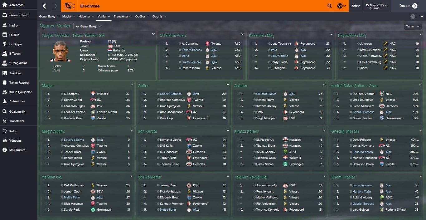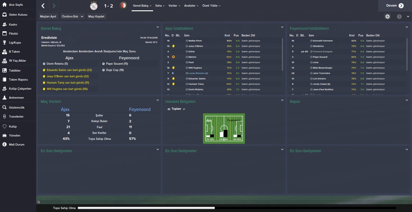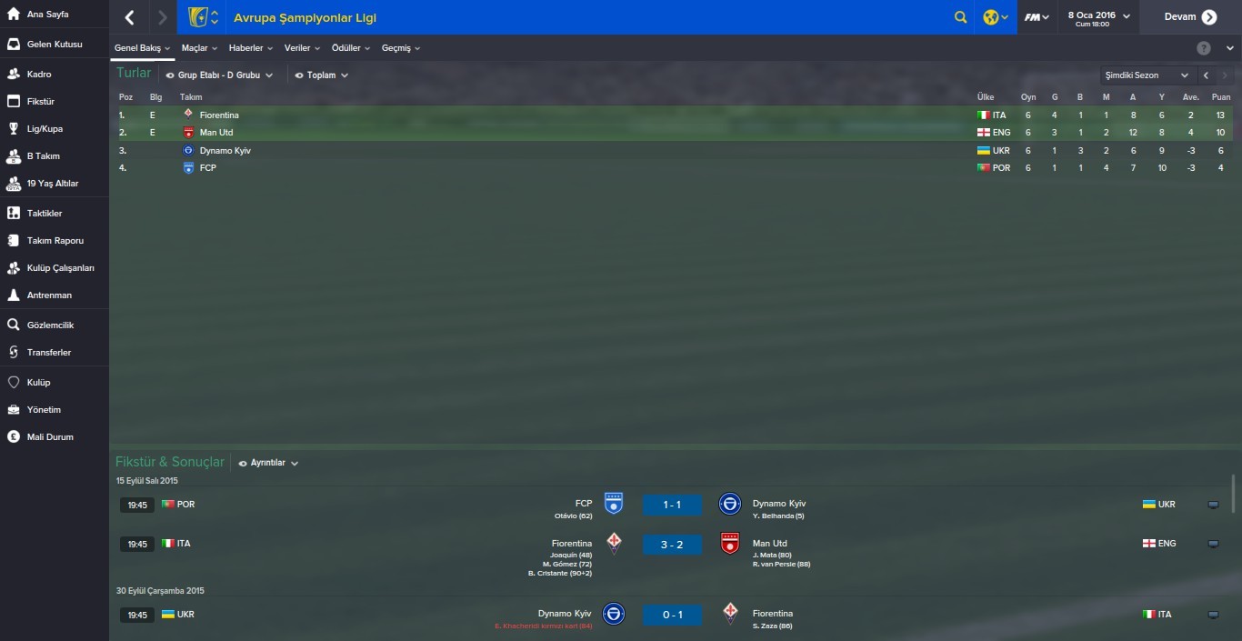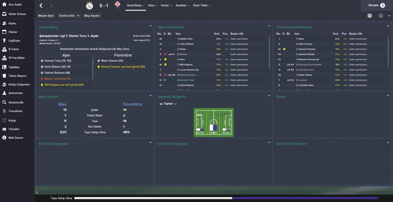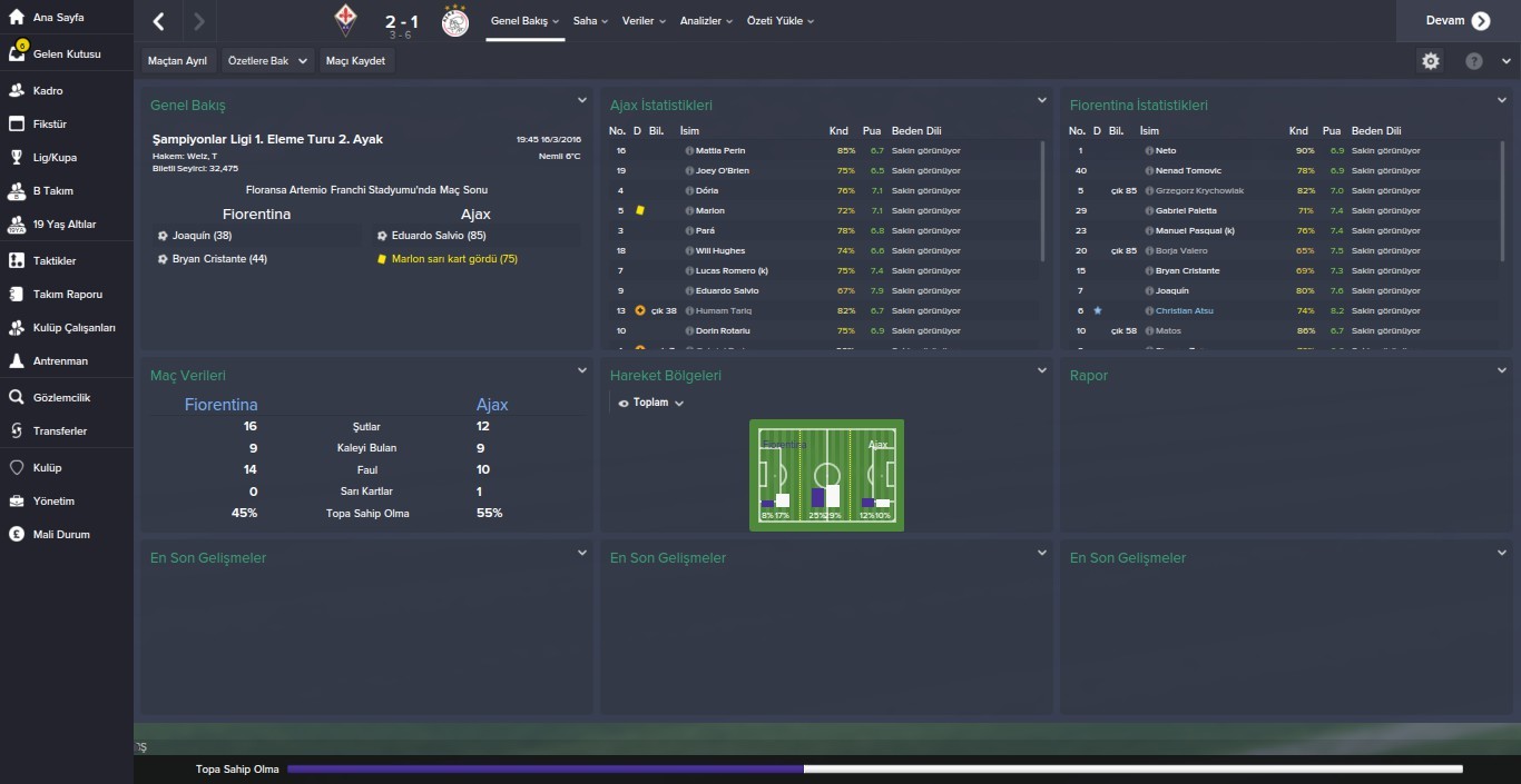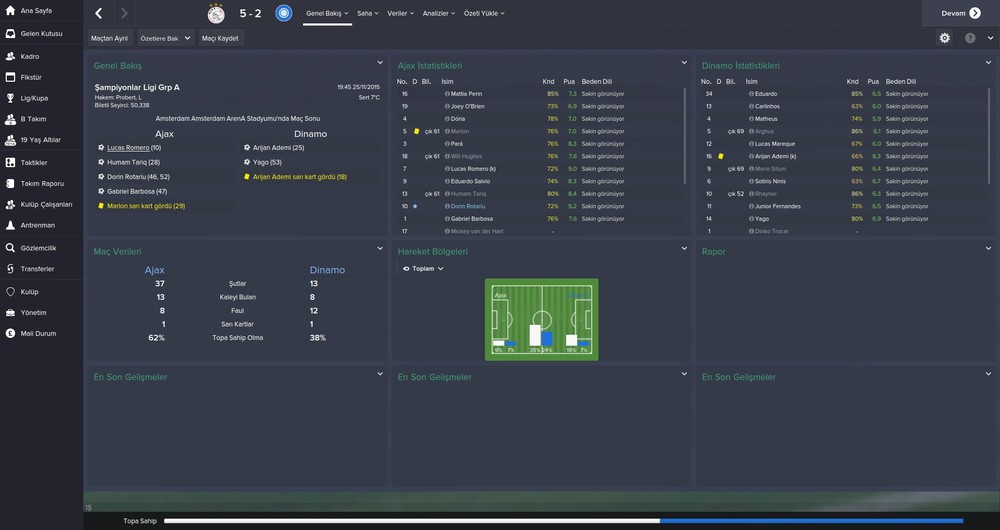sezonun ilk yarısını da tamamladık. Şampiyonlar liginde istediğimizi alamadık, ligde de performansımız iyi olsa da bir türlü koparamadık. < Resime gitmek için tıklayın > oynanan maçlar < Resime gitmek için tıklayın > Oyuncu performansları. Salvio ve Barbosa skor üretimi konusunda takımı taşısalar da takımın yıldızı doria. Defansta oynadığı müthiş oyunun yanında 7 gol 6 asistlik de bir katlı verdi. < Resime gitmek için tıklayın > Önemli maçlar Dinamo 2-5 Ajax < Resime gitmek için tıklayın > Psg 2-1 Ajax 92 de yediğimiz golle Ş.ligi grup liderliğini kaçırdık. < Resime gitmek için tıklayın > Ve başarılı performans sonrası premier ligde çıkış arayan tottenhamdan teklif aldık. < Resime gitmek için tıklayın > < Resime gitmek için tıklayın > Ajax yönetimi de gitmemem için bir toplantı düzenledi. Sonuçta Ajaxta kaldım. < Resime gitmek için tıklayın > |