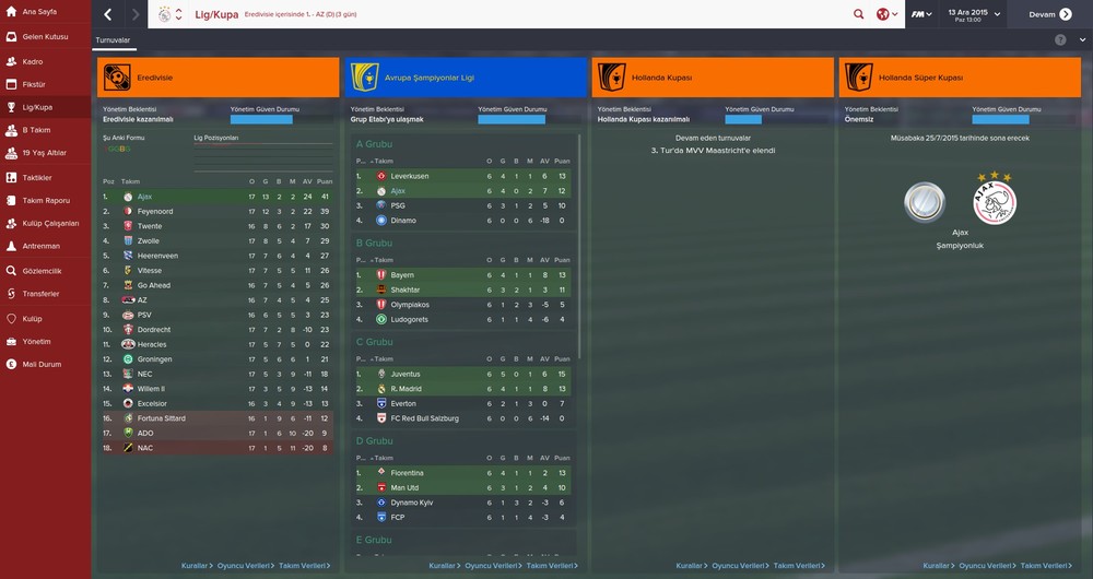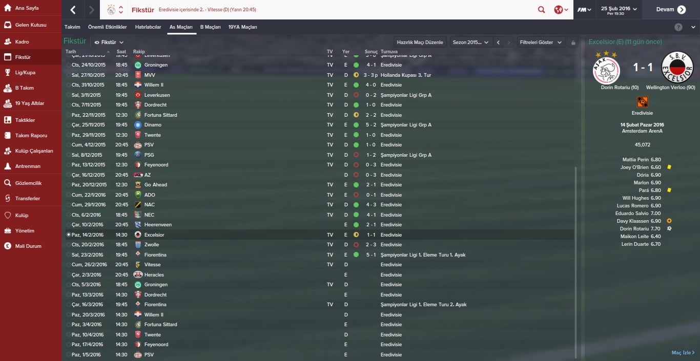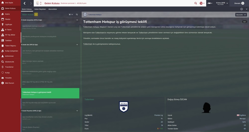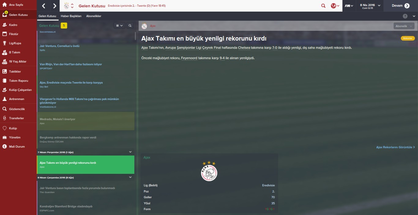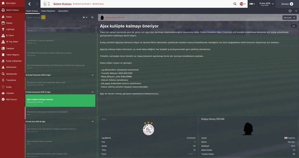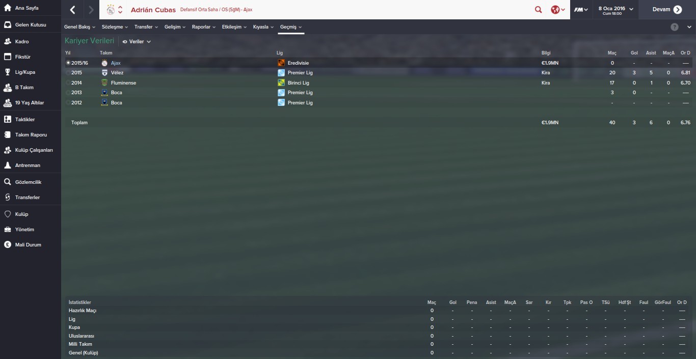 sezonun ilk yarısını da tamamladık. Şampiyonlar liginde istediğimizi alamadık, ligde de performansımız iyi olsa da bir türlü koparamadık. < Resime gitmek için tıklayın > oynanan maçlar < Resime gitmek için tıklayın > Oyuncu performansları. Salvio ve Barbosa skor üretimi konusunda takımı taşısalar da takımın yıldızı doria. Defansta oynadığı müthiş oyunun yanında 7 gol 6 asistlik de bir katlı verdi. < Resime gitmek için tıklayın > Önemli maçlar Dinamo 2-5 Ajax < Resime gitmek için tıklayın > Psg 2-1 Ajax 92 de yediğimiz golle Ş.ligi grup liderliğini kaçırdık. < Resime gitmek için tıklayın > Ve başarılı performans sonrası premier ligde çıkış arayan tottenhamdan teklif aldık. < Resime gitmek için tıklayın > < Resime gitmek için tıklayın > Ajax yönetimi de gitmemem için bir toplantı düzenledi. Sonuçta Ajaxta kaldım. < Resime gitmek için tıklayın > |