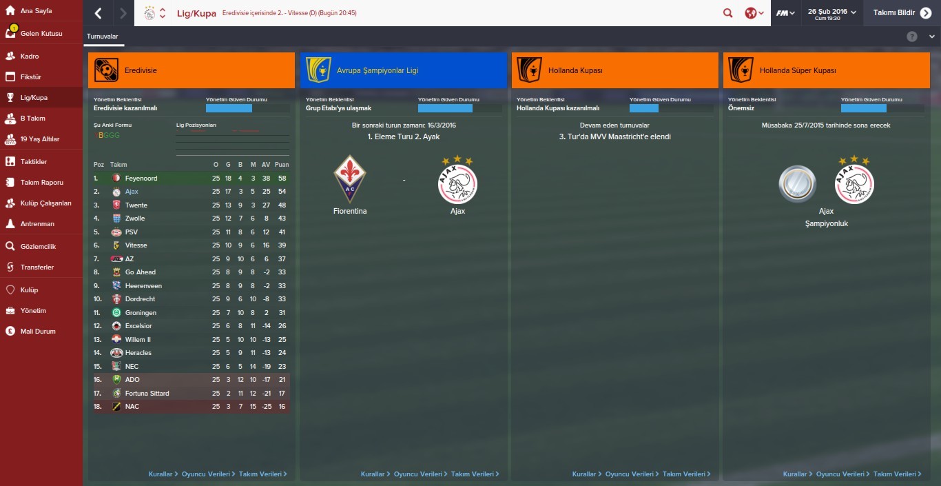 2. yarıda ligde durumlar iyi gitmiyor, 11 puan kaybettik şu ana kadar. < Resime gitmek için tıklayın > Bu sonuçların ardından şu anda Feyenoordun arkasında kaldık. < Resime gitmek için tıklayın > Ancak şampiyonlar ligindeki ajax fırtınası devam ediyor. Fiorentinanın işini ilk maçta bitirdik. < Resime gitmek için tıklayın > |