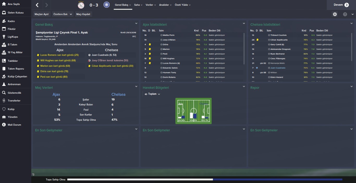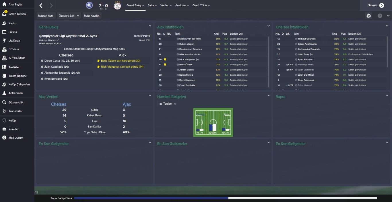 Fiorentinaya 2. tur 2. maçında 2-1 kaybetsek de ilk maçtaki farklı skorun avantajıyla çeyrek finale yükseldik. < Resime gitmek için tıklayın > Çeyrek finalde kura şansımızı devam ettiremedik, lille, sporting gibi takımların arasından chelsea çektik. İngiliz devine karşı ilk maça evimizde büyük umutlarla çıktık ama arada çok fark vardı. < Resime gitmek için tıklayın > İlk maçta aldığımız farklı yenilgi ve ligdeki kritik durum sebebiyle chelsea deplasmanına yedek çıktık. Sonuç= < Resime gitmek için tıklayın > Rekorlara Doyamadık < Resime gitmek için tıklayın > Bu sonuçların ardından şamliyonlar liginden elendik. Ligde ise durumlar çok karışık. 32. hafta sonunda feyenoord ile aramda 1 puan fark var ve 33. hafta evimde feyenoord ile oynuyorum. < Resime gitmek için tıklayın > < Resime gitmek için tıklayın > Feyenoord maçının sonucu ve şampiyonun kim olacağı ise yarın gazeteniz fanatikte. |