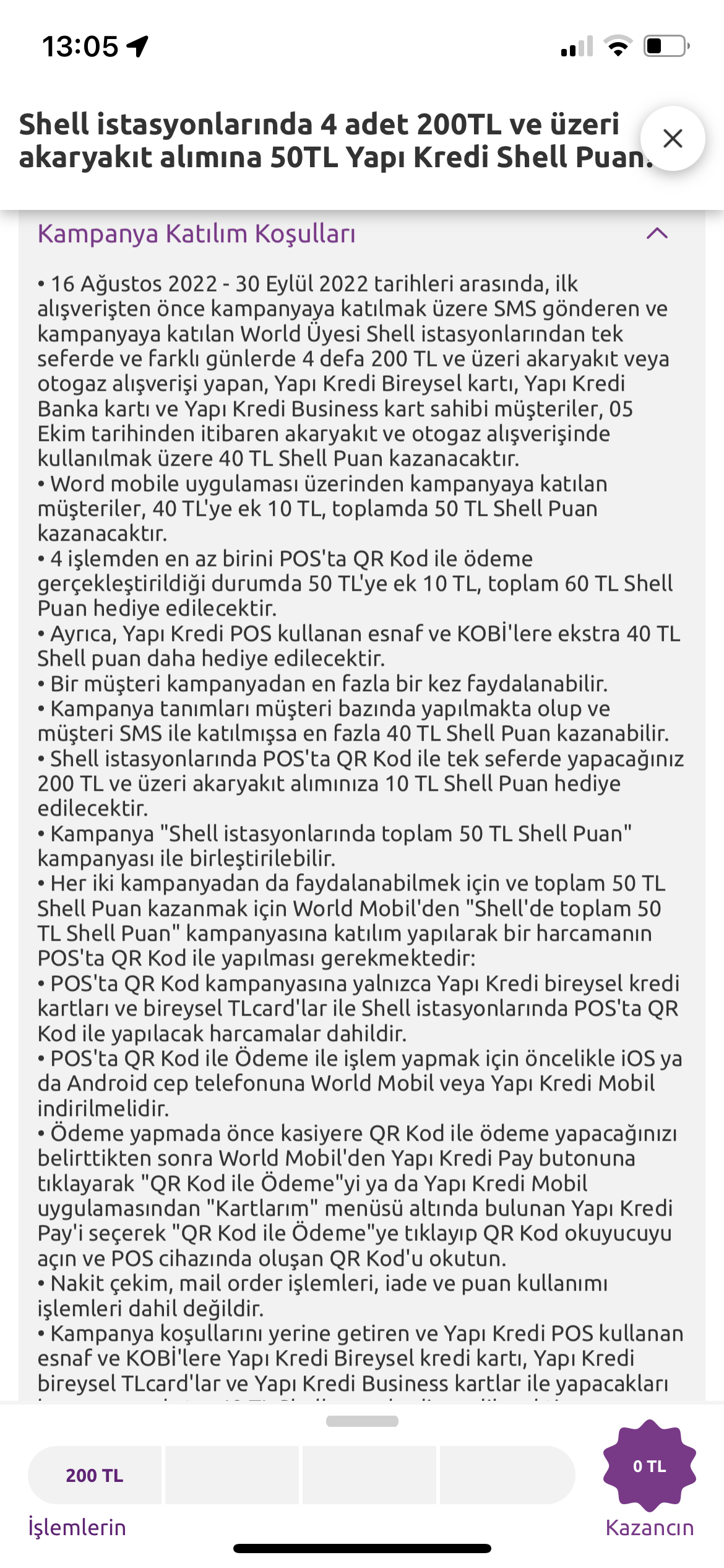 Temmuzun ilk kampanyası geldi. Her ay başka bir akaryakıt istasyonuna sokmaktan bıkmadı World, geçen ay Opet'ti şimdi Shell'den alacaksınız diyor. :D Opet'te ne güzel mobil ödeme kombosu vardı üzdü bu durum. Opet bu ay hangi bankayla anlaştı acaba TEB olabilir, yakında duyurulur. İlk mesaj güncel. Shell istasyonlarında 4 adet 200TL ve üzeri akaryakıt alımına 50TL Yapı Kredi Shell Puan! Kampanya Koşulları Shell istasyonlarında 4 adet 200TL ve üzeri akaryakıt alımına 50TL Yapı Kredi Shell Puan! 1 Temmuz – 15 Ağustos 2022 tarihleri arasında, ilk alışverişten önce kampanyaya katılmak üzere SMS gönderen ve kampanyaya katılan World Üyesi Shell istasyonlarından tek seferde ve farklı günlerde 4 defa 200 TL ve üzeri akaryakıt veya otogaz alışverişi yapan, Yapı Kredi Bireysel kartı, Yapı Kredi Banka kartı ve Yapı Kredi Business kart sahibi müşteriler, 19 Ağustos tarihinden itibaren akaryakıt ve otogaz alışverişinde kullanılmak üzere 40 TL Shell Puan kazanacaktır. Word mobile uygulaması üzerinden kampanyaya katılan müşteriler, 40 TL’ye ek 10 TL, toplamda 50 TL Shell Puan kazanacaktır. 4 işlemden en az birini POS'ta QR Kod ile ödeme gerçekleştirildiği durumda 50 TL’ye ek 10 TL, toplam 60 TL Shell Puan hediye edilecektir. Detay: https://www.worldcard.com.tr/kampanyalar/shell-istasyonlarinda-4-adet-200tl-ve-uzeri-akaryakit-alimina-50tl-yapi-kredi-shell-puan Temmuz ayı yakıt kampanyaları en geç pazartesi belli olur diğer bankaların. Belli oldukça mesaj atın ilk sayfaya ekleyeyim, ben de kendi bankalarımdan bakıp ekleyeceğim. |