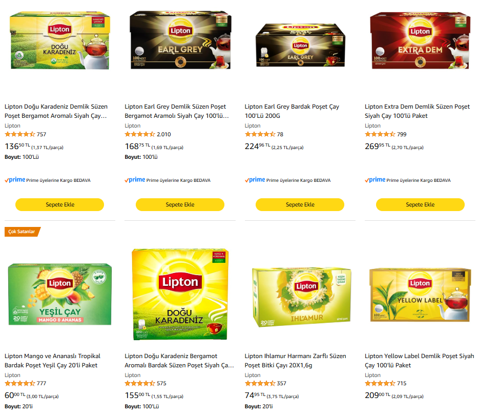 Lipton Tiryaki Harmanı 1000g 2 adet alımda tanesi 187 TL https://www.amazon.com.tr/dp/B0DV915HK4 Lipton Doğu Karadeniz 500'lü Demlik Poşet Çay 2 adet alımda tanesi 415 TL https://www.amazon.com.tr/dp/B0D5HXDGMH |