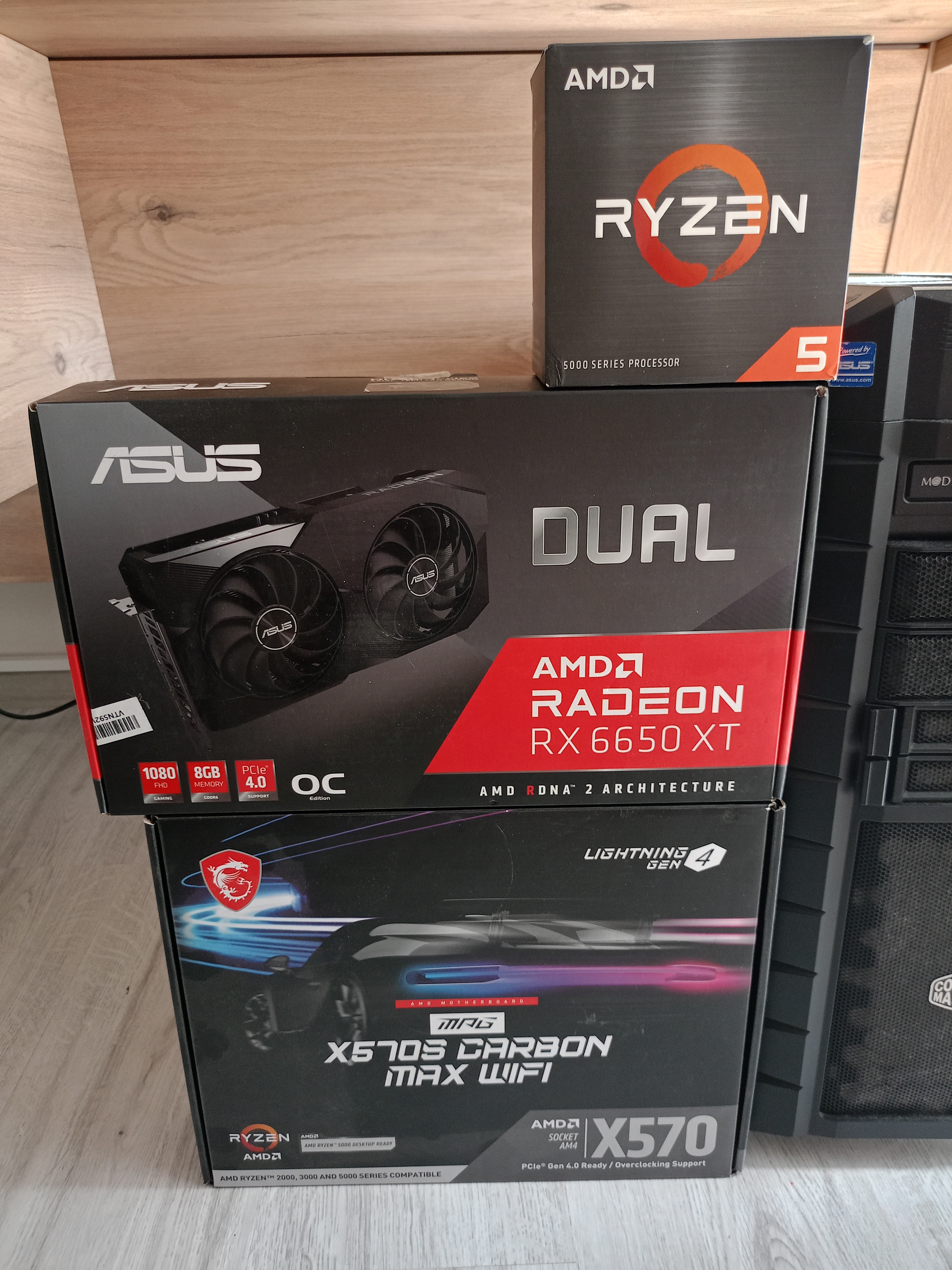 işlemci ryzen 5600x . anakart msı x570s carbon wifi ekran kartı asus dual 6650 xt ramler Kingston fury beast 2x16 32 gb 3200 mhz cl16 işlemci soğutucu noctua nh d15chromax blackdesign çift fanlı anakart işlemci ekran kartı işlemci soğutucu kullanmaya başlayalı toplamda 1 yılı belki birkaç ay geçmiştir. powe suply high power 750wat b12 80 plas +bronz kasa coolmaster hafx 942 midtower kasa. sss ve harddiskler satılık değildir tüm bu parçalar bu şekilde 30000 tl. am5 platformuna gececeğim için satıyorum tüm güncel oyunları oynatır kocaeli içi alsn kişi elden bakarak ve görerek kontrol edip satın alması Tercihimdir diğer türlü satış yok işlemci ve ekran kartı garantiden yenisi gelmiştir