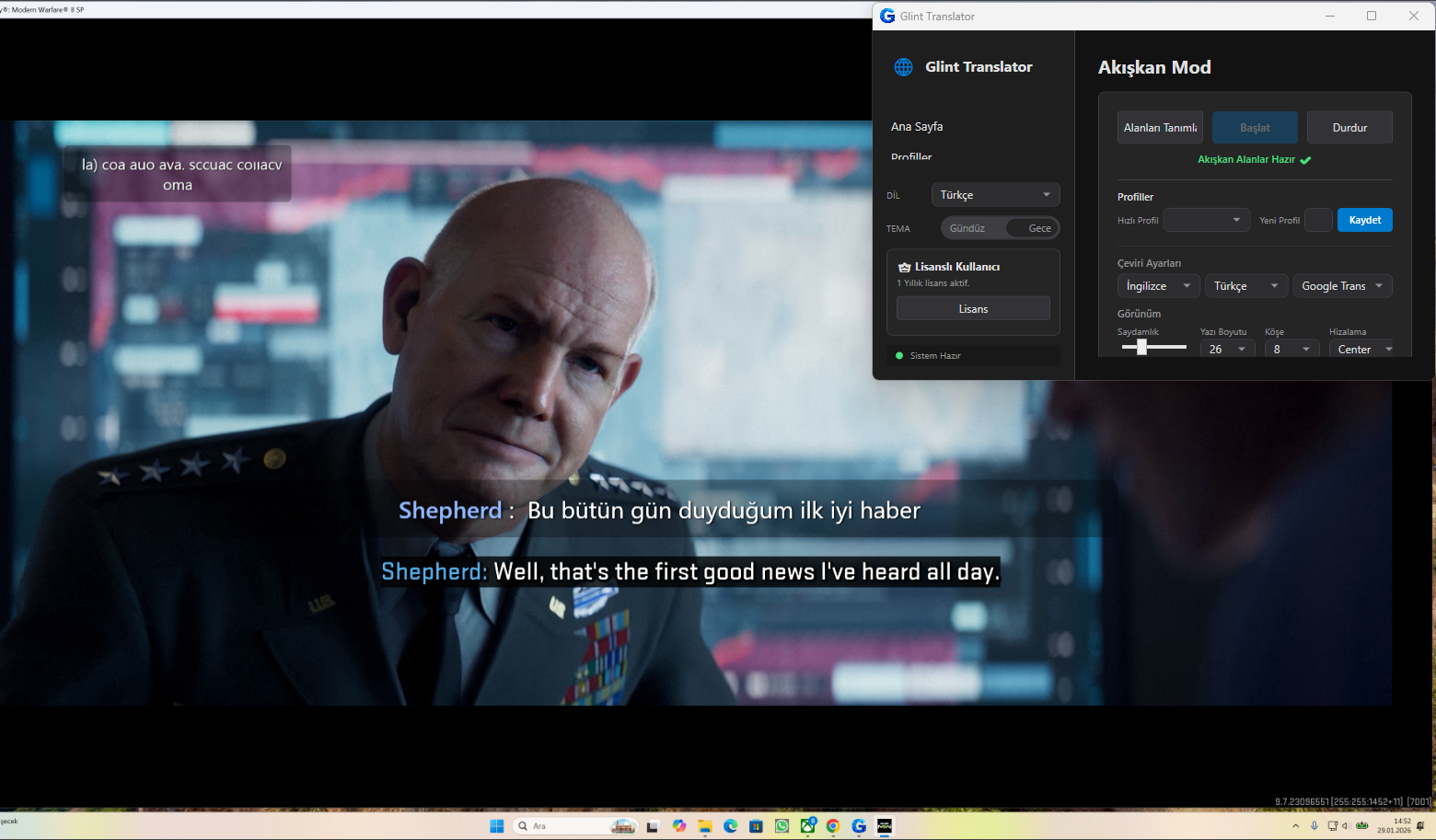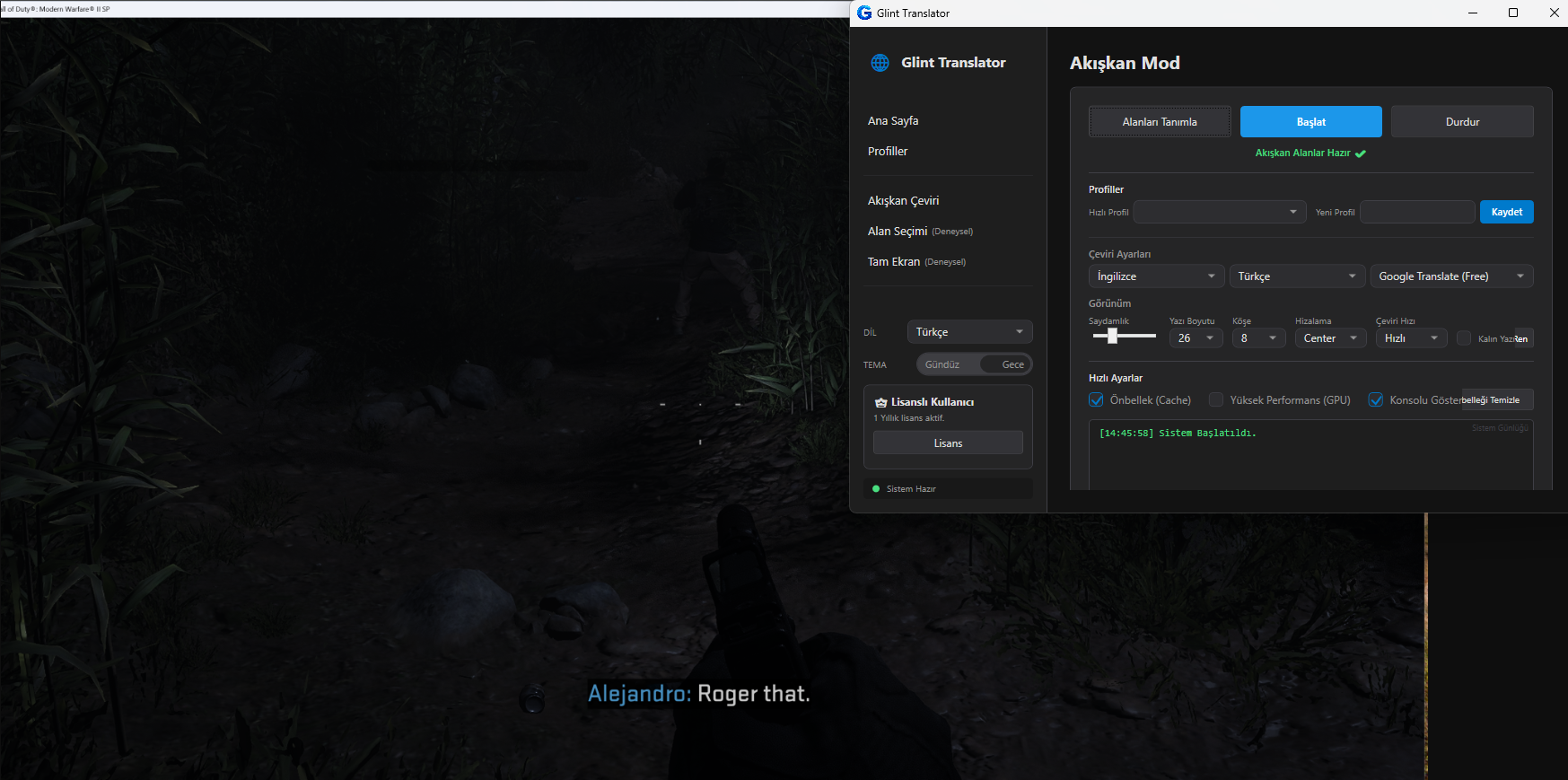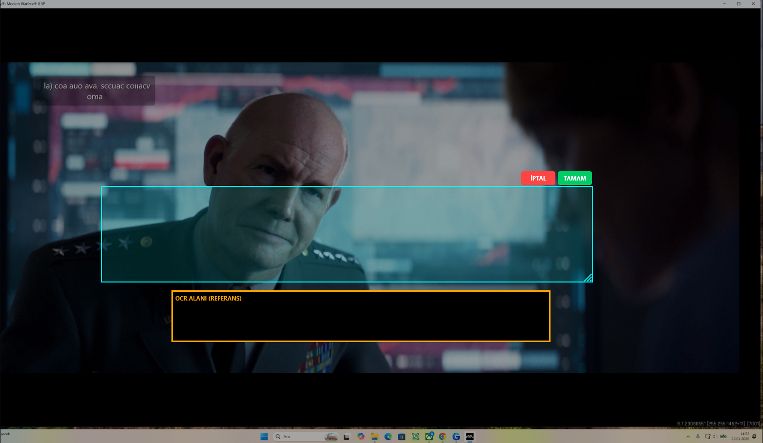 | Akışkan çeviri bölümünden alanları tanımla butonuna basıp İngilizce metinlerin hangi alanda döndüğünü seç 2. seçim ekranında ise çevirinin nereye yazılacağı overlay bölümünü ayarla üst üste gelmesinler 2. ovarlay i 3 satır sığacak şekilde ayarla daha sonra başlat a yaptığın ayarıda COD diye kaydet her seferinde kaydetmek zorunda kalmazsın |