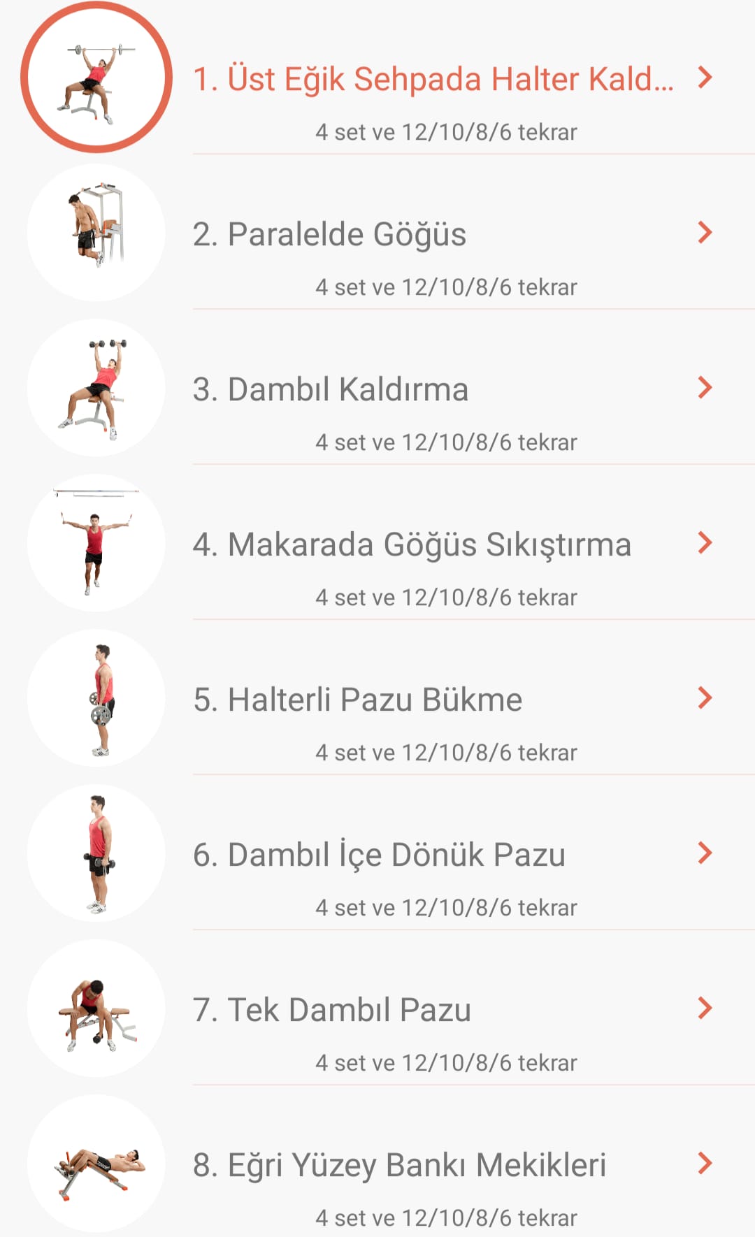 Programım Haftada 4 gün, bütün hareketler 12 10 8 6 tekrar şeklinde 4 set.