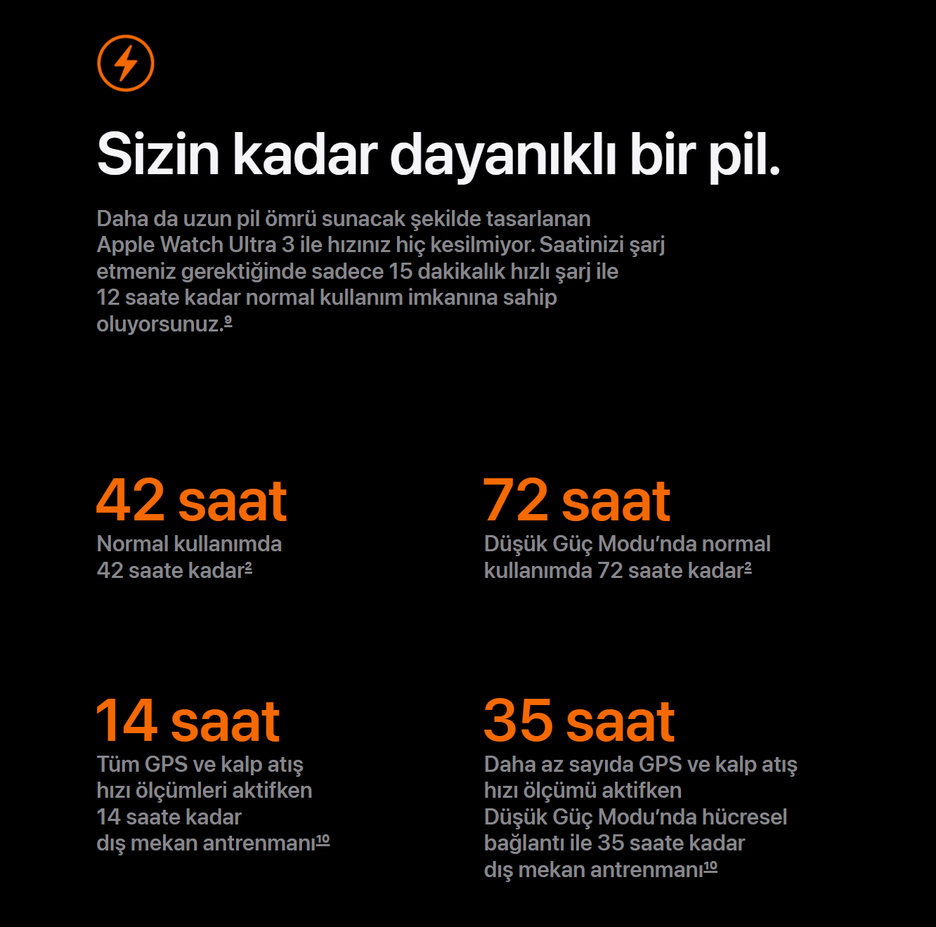 apple watch ultra 2 ve ultra 3 benzer batarya süresine sahip... ikisi de always on display açık senaryoda 2.5 gün civarı gidiyor.