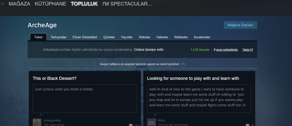 | İyi geceler arkadaşlar hala buradamısınız bilmiyorum ama Rangora serverında TÜRK guildi olan ETERNAL çatısı altında toplanıyoruz ETERNAL olarak metin2 oyunundan archeage e başladık metin2 ye en büyük damgasını vuran lonca olarak kabak tadı vermeye başladıgı için arche age e geçiş yaptık aynı başarıyı burdada elde etmek istiyoruz 2008 den günümüze kadar profesyonel bi e spor kulubu falan olmadıgımız halde bugünlere kadar ayakta kalmayı başardıkhttps://www.facebook.com/ETERNALLoncasi/ bu sayfadan aramıza katılmak isteyen saygılı edepli dürüst insanları aramızda görmekten mutluluk duyarız Allah'a emanet olun |