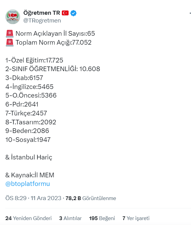 eğitimde de oecd ülkelerini yakaladık ama siz halen açık var diyorsunuz ama norm açık sayısından bihabersiniz her konu hakkında bilgi söylemeden önce araştırmanızı öneririm, yok öyle kulaktan duyma bilgileri burada söyleyip insanları yanıltmaya çalışmanızı anlamıyorum, 77bin tane norm açığı olmasına rağmen halen açık var diyorsunuz ???????????? yani fazla öğretmen var ona rağmen açık var demeniz norm açığı nedir? < Resime gitmek için tıklayın > < Resime gitmek için tıklayın > < Resime gitmek için tıklayın > |