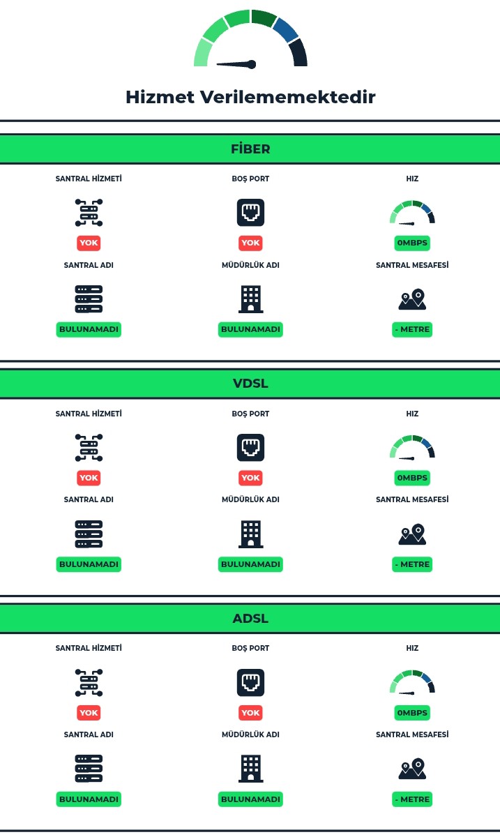 Hocam merhaba iyi günler. Verdiğiniz linkten altyapı sorgu yaptığım zaman adresimde hiç hizmet yok maalesef ve bağlı olunan santral ve müdürlük bulunamadı yazıyor bu durumda ne yapmam gerekiyor. < Resime gitmek için tıklayın >