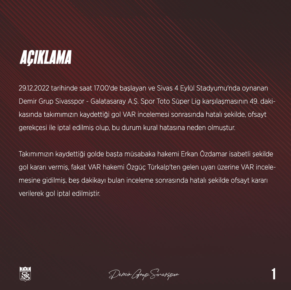TFF, tartışmalı maçlardaki kararları açıkladı. TFF'nin yayınladığı VAR kayıtlarına göre Sivasspor'un Galatasaray karşısında attığı gol Nelsson, pozisyondaki ikinci adam olarak kabul edildiği için ofsayt gerekçesiyle iptal edildi. TFF'den yapılan açıklamada; "Gaziantep FK - Beşiktaş ve Sivasspor - Galatasaray maçlarının VAR kayıtları incelendi ve bahsi geçen maçlarda hakemlerin, önemli hakem hatası yaptıkları tespit edilmiştir. Bu maçların VAR kayıtlarının yayınlanmasına karar verilmiştir." denildi. Hakemlerin konuşması VAR ile Erkan Özdamar arasındaki konuşma da yayınlandı. VAR'dan gelen uyarıda; "Erkan, Sivaslı futbolcu topa dokunmuyor ama Nelsson'u itiyor." deniliyor. Erkan Özdamar ise; "Evet, çok net. Robin Yalçın'ın Nelsson'a teması var. Ofsayt var mı, bana onu söyleyin." cevabını veriyor. VAR'dan; "Evet, pozisyonda ofsayt var." cevabı geliyor. N'Kodou'nun pozisyonunda yaşanan konuşma VAR/AVAR: "Atilla ne gördün sen?" Atilla Karaoğlan: "Hafif bir dokunuyor şiddet yok. Vurma yok." VAR/AVAR: "İttiriyor diye mi görüyorsun? Sahada inceleme öneriyorum." Atilla Karaoğlan: "Şiddet yok diye gördüm." VAR/AVAR: "Kafa vurduğunu görüyorum ben de." Atilla Karaoğlan: "Evet ama şiddet var mı?" VAR/AVAR: "Var, kafayla vuruyor." Atilla Karaoğlan: "Tamam geldim." VAR/AVAR: "Bariz vurduğunu görüyorum ben." Atilla Karaoğlan: "Teması gördüm normal hızlı oynat. Burnuna dokunuyor. Abi abartıyor ya ben sarıda kalacağım." VAR/AVAR: "Karar senin tamam." |