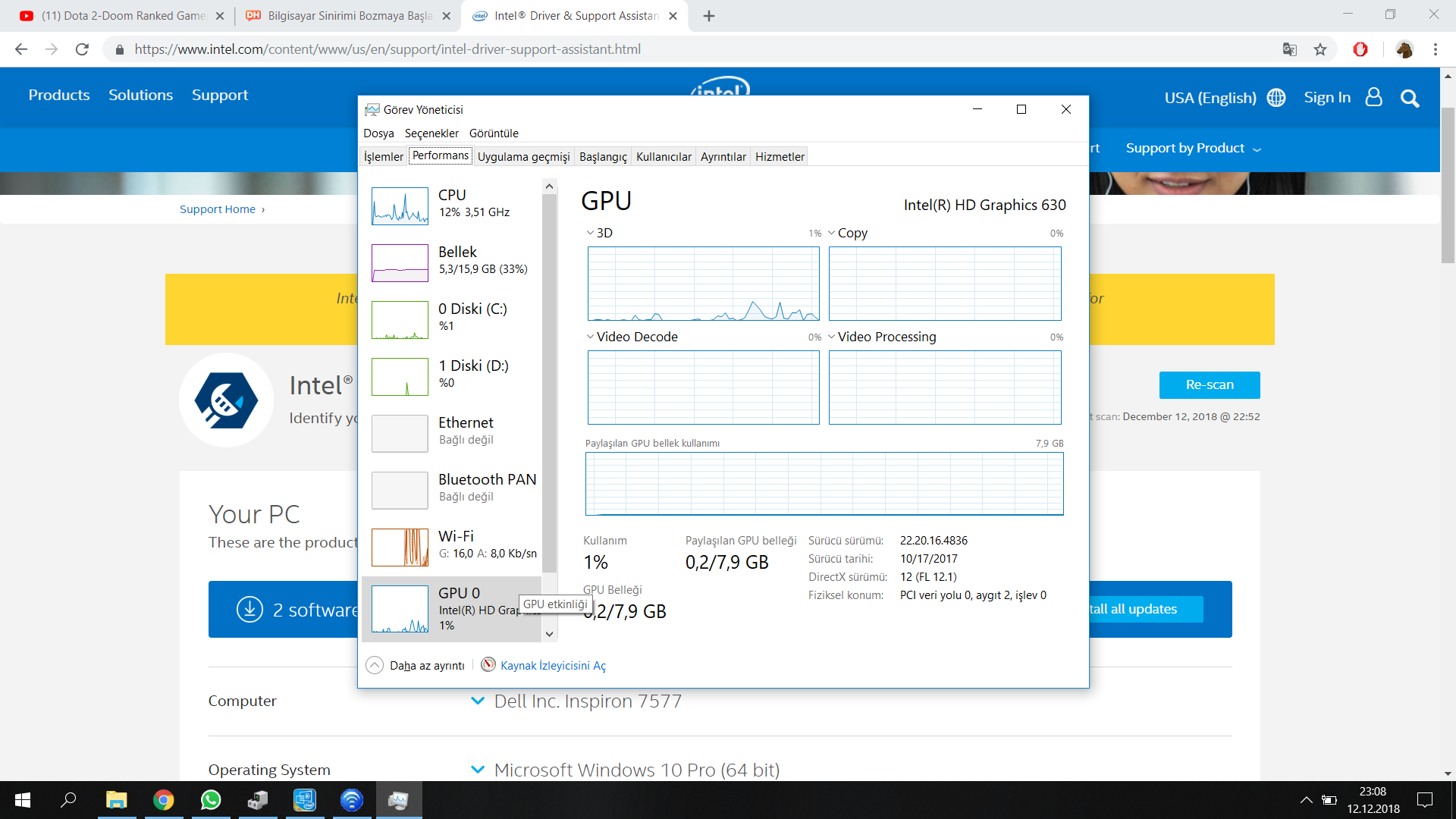 İsmim Furkan. Forumda yeniyim bu konudada bana yardımcı olabilirseniz sevinirim. 6-7 ay kadar önce Gittigidiyor.com dan kendime üniversitede autocad matlab gibi programları kullanmak, oyun oynamak -genellikle dota2-, dizi film izlemek ve internette gezinmek üzere Dell inspiron 7577 modelli bilgisayarı aldım. Hatırı sayılır bir para verdim ve özelliklerini çok iyi olarak aldım. Ama şuan tarayıcı da kasma problemleri yaşıyorum. Genellikle dota2 oynadığım için ondan örnek vereceğim diğer oyunlar hakkkında pek bilgim yok. Dota 2 oynarken son 2-3 aydır aşırı fps düşüşleri yaşıyorum 15-20 lere kadar. Ekran kartım nvidia gtx 1050 ti. klasörleri açarken kasma problemleri takılma problemleri yaşıyorum ve bu çok canımı sıkıyor. Yaz aylarında çok ısınıyordu laptop ısıtıcı aldım ama çok bir işe yaradığını söyleyemem. Prize takılı halde oyun oynarken %20-30 lara kadar şarj düşmesi yaşadığımdan dolayı servise götürdüm. 130W luk şarj aletini 180w şarj aletiyle değiştirdiler şarj düşmesi problemi çözüldü ama şuanki problemler şarj aletinden kaynaklanıyo olabilir mi? Bilgisayarı ilk aldığım zaman Ubunt işletim sistemi ile gelmişti ben windowsa alışkın olduğum için kardeşime windows kurdurdum daha sonra internetten 30-40 tl gibi bir ücrete windows 10 lisansı alıp kurulumu yaptım. Bu takılma ve kasma sorunları windows sürümüm orjinal olmadığı için olabilir mi? Bilgisayarımın özelliklerini ss alıp aşağıya ekliyorum bana yardımcı olabilirseniz çok sevinirim. Teşekkürler iyi akşamlar. İnternette yaptığım araştırmalara göre net bir bilgi bulamadım. Grafik kartımın (1050 Ti) çalışmadığı söyleniyor. Bilgisayar özürlüsü bir insanım o yüzden küçük çlocuğa anlatır gibi anlatırsanız çok sevinirim. İlginize teşekkürler :)