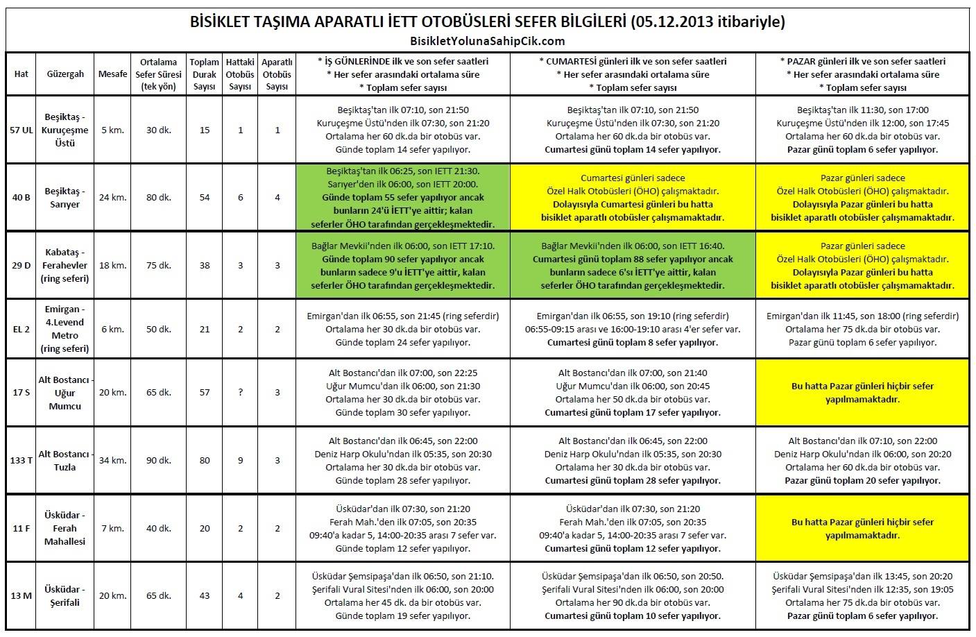 Bu konu hakkında aşağıdaki gibi bir tablo var ama, genel anlamda aparatlı İETT otobüslerinin durumu tamamen Allahlık. Ne hat bilgilerinde belirtilen saatte aparatlı araç gelir ne hangi hatta otobüs olduğu bellidir... "Siz istediniz, biz yaptık. Halkımıza hizmette sınır yok" durumu var ama bu hizmetin uygulanışı, sürekliliğinin takibi kısmında hiçbir icraat yok.