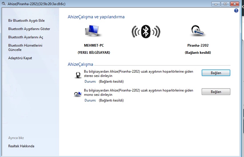 Fakat bluetooth kulaklığımı da bilgisayara bağlamak istiyorum. Cihaz ekle kısmından kulaklığı gördü, ekledim ve kulaklık da listede gözüküyor. Fakat bağlan dediğimde a2dp başarısız oldu şeklinde bir uyarı alıyorum.
