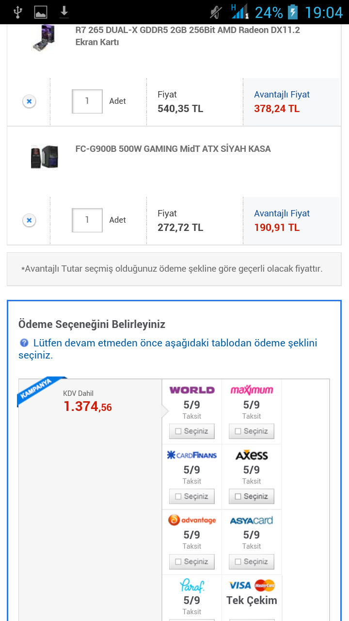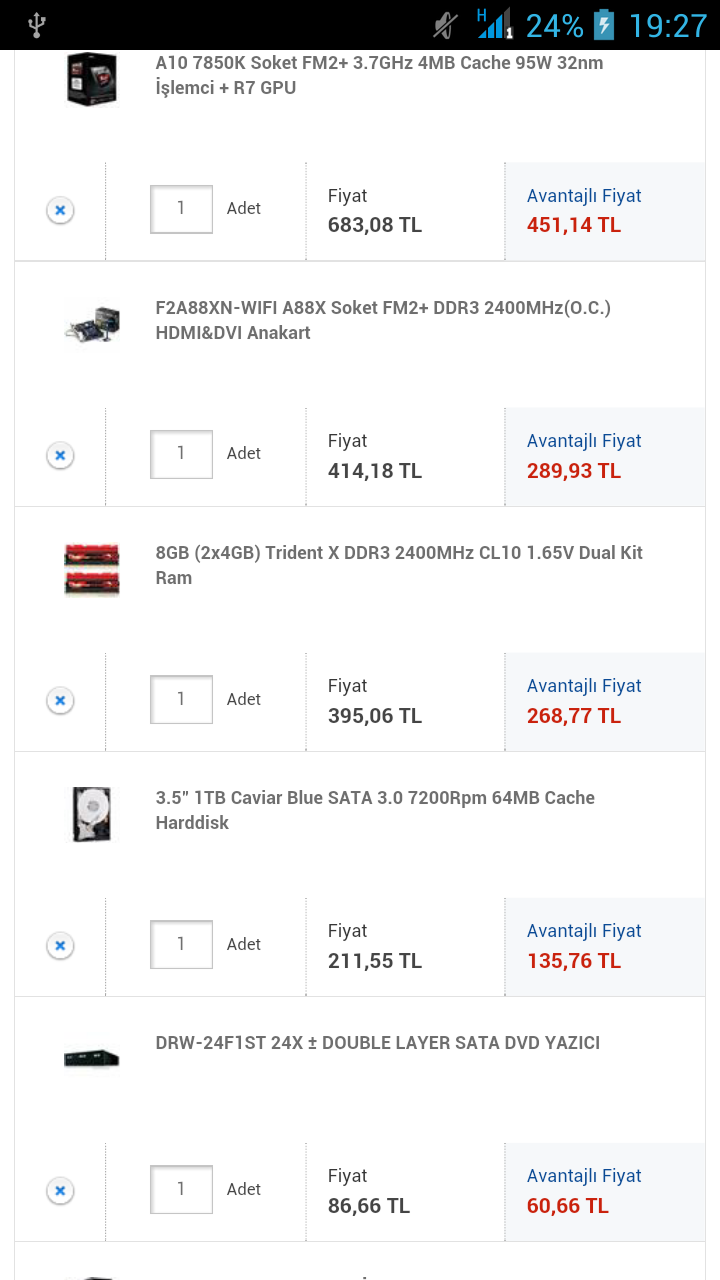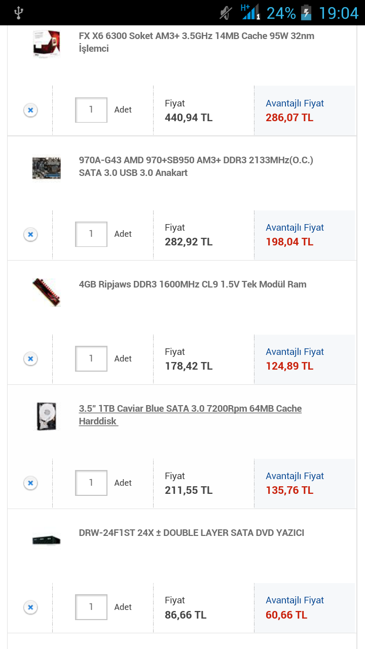 Hocam son seklini yaziyorum eger bir uyum problemi yoksa bunu siparis etmeyi düsünüyoruz. Sizinde yardimlariniz sonucu böyle bir sey çikti ortaya su ise yaramaz dediginiz bi parça var mi yoksa bunu siparis edelim mi ? Anakart:www.vatanbilgisayar.com/970a-g46-amd-970-sb950-am3--ddr3-2133mhzoc-sata-30-usb-30-anakart.html Dvd rw :http://www.vatanbilgisayar.com/drw-24f1st--24x-%C2%B1-double-layer-sata-dvd-yazici.html Harddisk :http://www.vatanbilgisayar.com/35-1tb-sv35-guvenlik-diski--sata-30-64mb-cache-7200rpm-ncq-hard-disk.html Kasa :http://www.vatanbilgisayar.com/gz-f10-550w-midt-atx-siyah-kasa.html Ram :http://www.vatanbilgisayar.com/8gb-ripjawsx-ddr3-1866mhz-cl10-tek-modul-ram.html İslemci :http://www.vatanbilgisayar.com/fx-x6-6300-soket-am3--35ghz-14mb-cache-32nm-islemci.html Ekran Karti :http://www.vatanbilgisayar.com/r9-270-directcu-ii-2gb-gddr5-256bit--amd-radeon-dx112-ekran-karti.html |