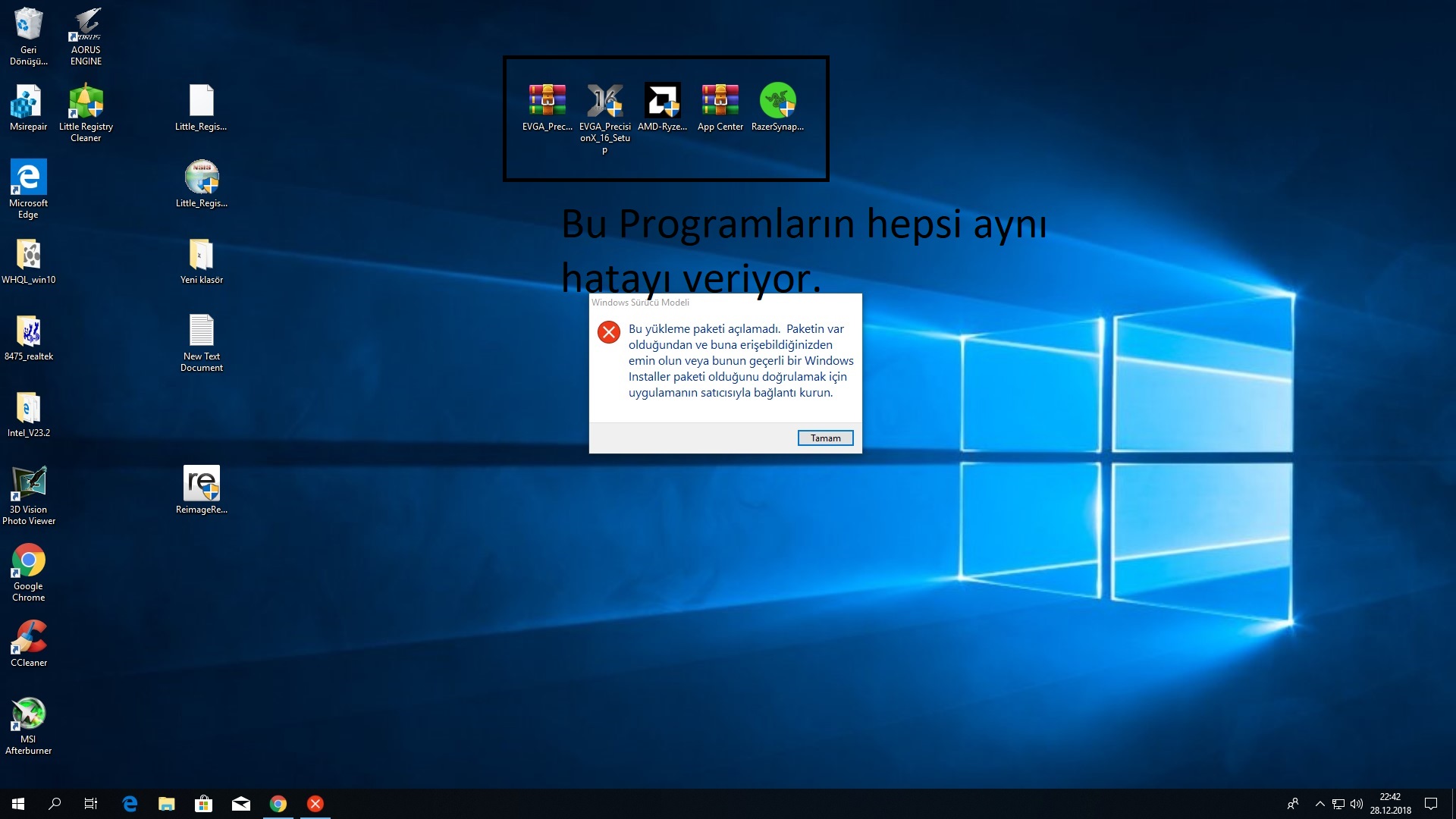 internette denemedigim kalmadı 10 kere format attım ama her formatta aynı hatayı alıyorum. Resimdeki programların hepsi aynı hatayı veriyor lütfen yardım edin.