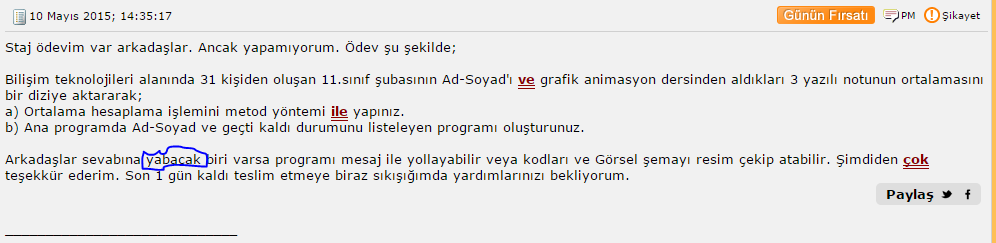Ne alaka şimdi diploma ? Onu anlayamadım. Ben başlığa "ödevim var yardım edermisiniz" yazdım. Madem yardımcı olmayacaksın konuya girip tantana yapma sebebin ne onuda anlamadım. |