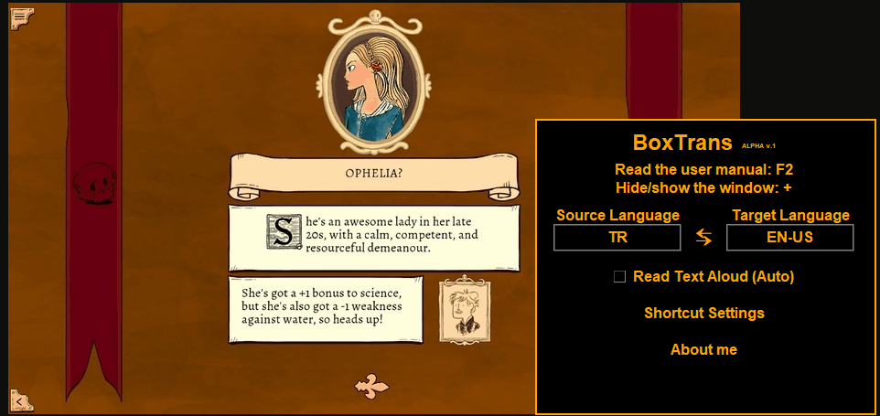 Burada benim çözüm olarak aradığım şey çok iyi bir çeviri değil . Mesela bu oyunun tüm metnini google çeviriden kopyala yapıştır bile yapsak bana yeter. Ben bu tür oyunları oynarken telefonumdan google çeviriyi kullanarak bir süre oynamayı başardım ama bir yerden sonra çok yorucu oluyor. Oyun çevirisi hakkında hiç bir bilgim yok.. ve Alt yazıları çevirebilen bir program vs. var mıdır? yok mudur? onuda pek araştıramadım açıkçası. Bildiğiniz bir program yada ona benzer bir şeyler, konuyu aydınlatacak bilgileriniz fikirleriniz varsa desteklerinizi bekliyorum.