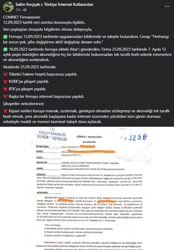 Konuyu açan @poeDameron1138 arkadaşa teşekkürler, yalnız kvkk şikayetlerinde yasa gereği önce ilgili firmaya şikayet oluşturmak firmadan gelen olumsuz aksiyon neticesinde belgelerle kvkk ya başvurmak gerek, konuyu bu şekilde güncellerseniz sevinirim Ben de veri sızıntı mağduruyum 1. Firmaya ihtar 2. Kvkk şikayet 3. Mahkemeye maddi ve/veya manevi tazminat Yolunu izliyorum |
