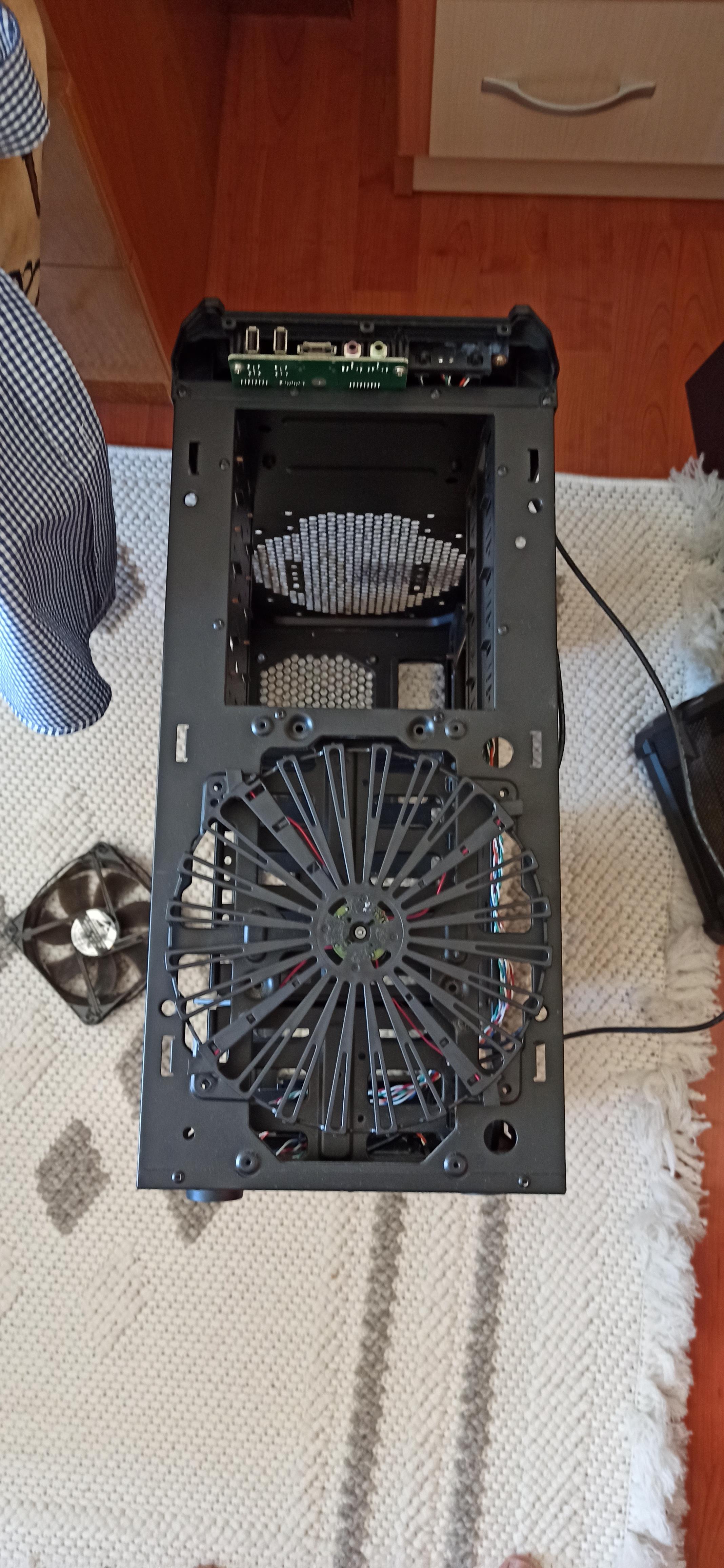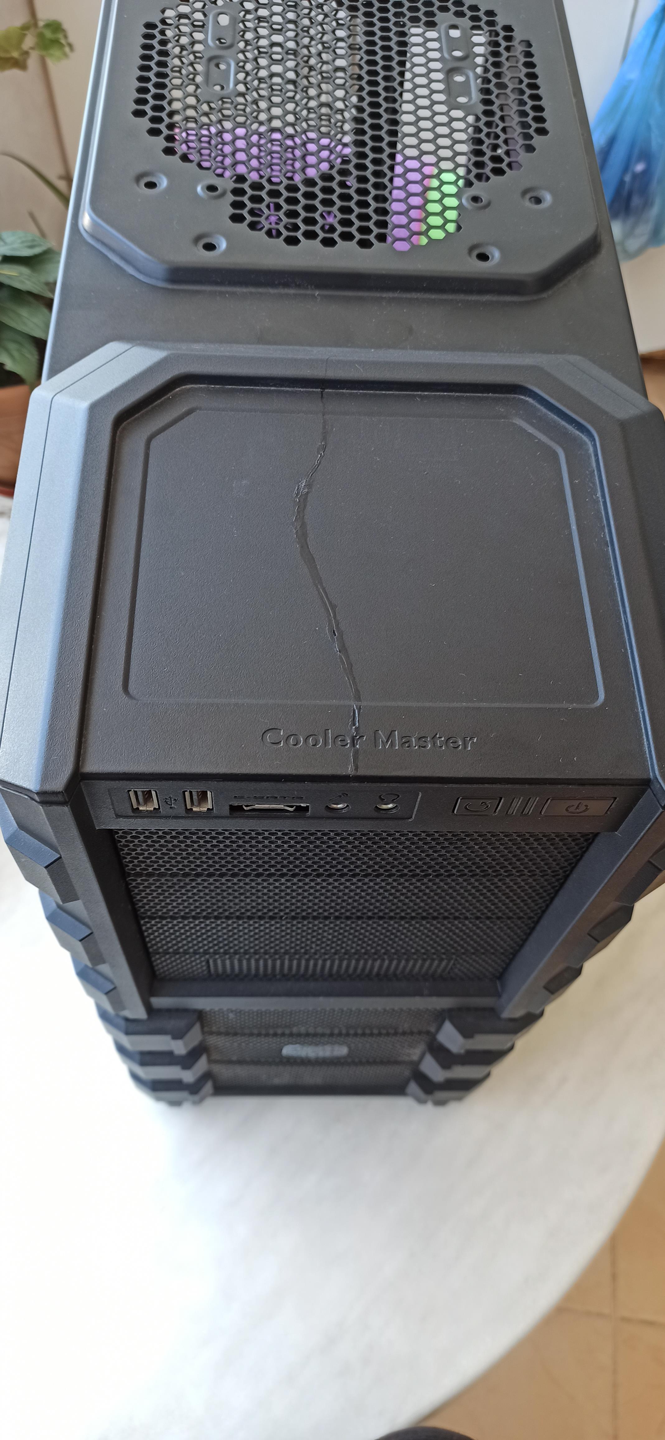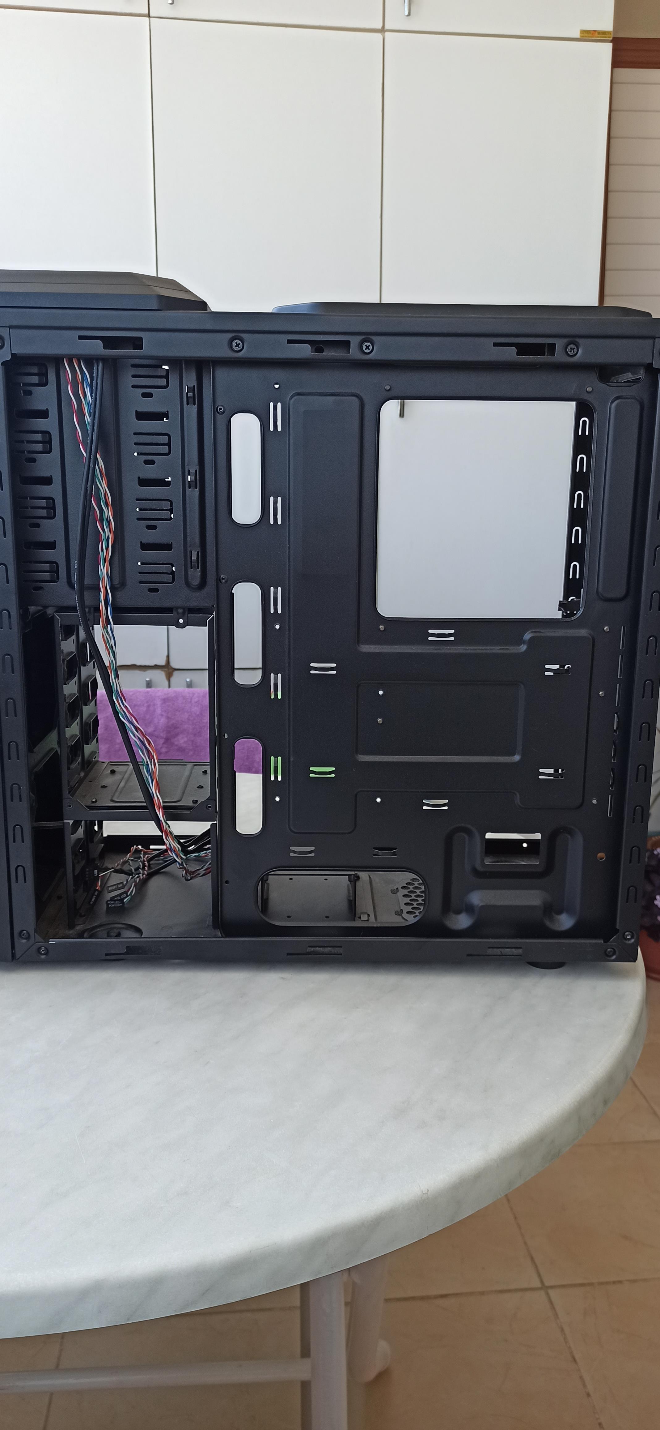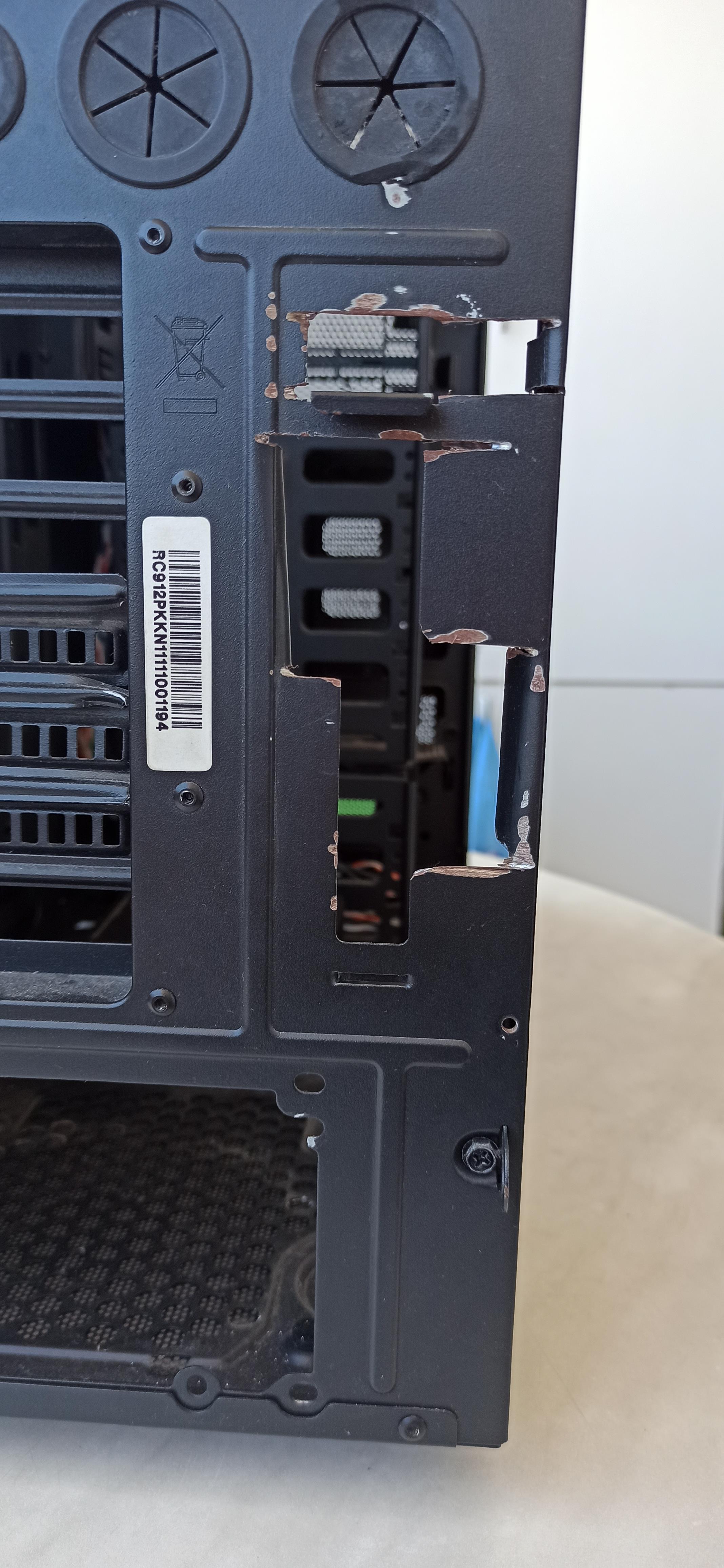 Kasanın üst plastik panelinde kırık vardı ve yapıştırdım. Hafif zımpara ve biraz boyayla kapatılabilir. Sağ ön ayağı biraz içeri girdiğinden kasa hafif yan yatıyor. Ekran kartını dikey takabilmek için arka kısımda biraz kesme yapmıştım.