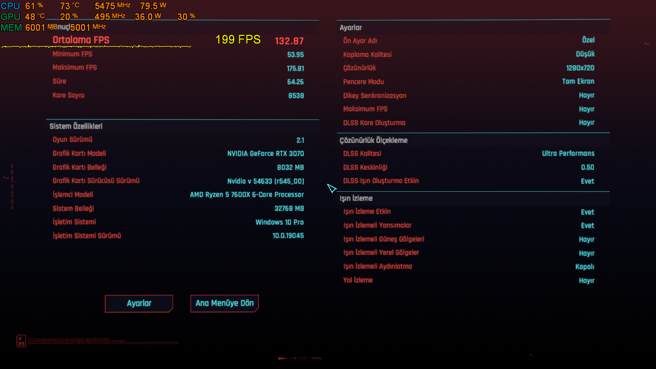 Guardians of Galaxy 6400mhz cl30 222 fps, EXPO 6000mhz cl30 203 fps < Resime gitmek için tıklayın > Forza Horizon 5 6400mhz cl30 335 fps, EXPO 6000mhz cl30 324 FPS < Resime gitmek için tıklayın > Cyberpunk 2077 6400mhz cl30 135 fps, EXPO 6000mhz cl30 123 FPS < Resime gitmek için tıklayın > Ayrıca Cyberpunk 2077 6400mhz cl30 % 1 low 86 % 0.1 low 77 fps, EXPO 6000mhz cl30 % 1 low 77 % 0.1 low 54 fps Testleri ekran kartı limitine takılmaması için düşük ayarlar ve çözünürlüklerde yaptım. Yaptığım ayarları ekran görüntüsünden görebilirsiniz. |