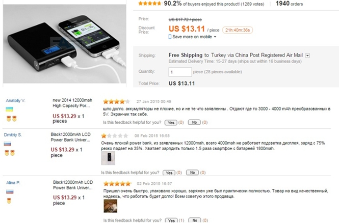 Resimde de görüldüğü gibi yorumlarda 12.000 olmadığına dair yazılar görüyoruz.Bunlar normalde alt alta değil ve bazıları arka sayfalarda ancak dikkatli bir gözlemle bunları bulabilirsiniz.Peki neden bazıları 5 yıldız verip hiç bir olumsuz görüş bildirmemiş.Çünkü birçok kişi ürünün dışı görünüşüne ve çalışıp çalışmadığına bakıp yorumu giriyor bu yüzden powerbank alırken en büyük rehberiniz olumsuz yorumlar olmalı.