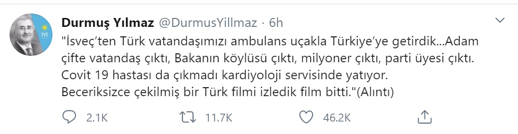 1. İsveç vatandaşı için devletim uçak kaldırmış, milyonlar harcamış. Siz de bunun reklamını yapıyorsunuz 2. Türkçe yazımında dahi anlamına gelen de ve da' lar ayrı yazılır. Lütfen ilkokula geri dönün Türkçe yazmayı öğrenin. 3. Türkçe noktalama işaretlerinde .. şeklinde bir işaret yok. Cümleniz bitince tek nokta yeterli. Lütfen arada kitap okuyun. Hem noktalama işaretlerini öğrenir hem de vatandaşlık nedir, devletin görevleri nelerdir onu da öğrenirsiniz. Tekrar başa dönersek İsveç vatandaşına benim paramla yapılan gereksiz kıyağın reklamına ihtiyacımız yok. |