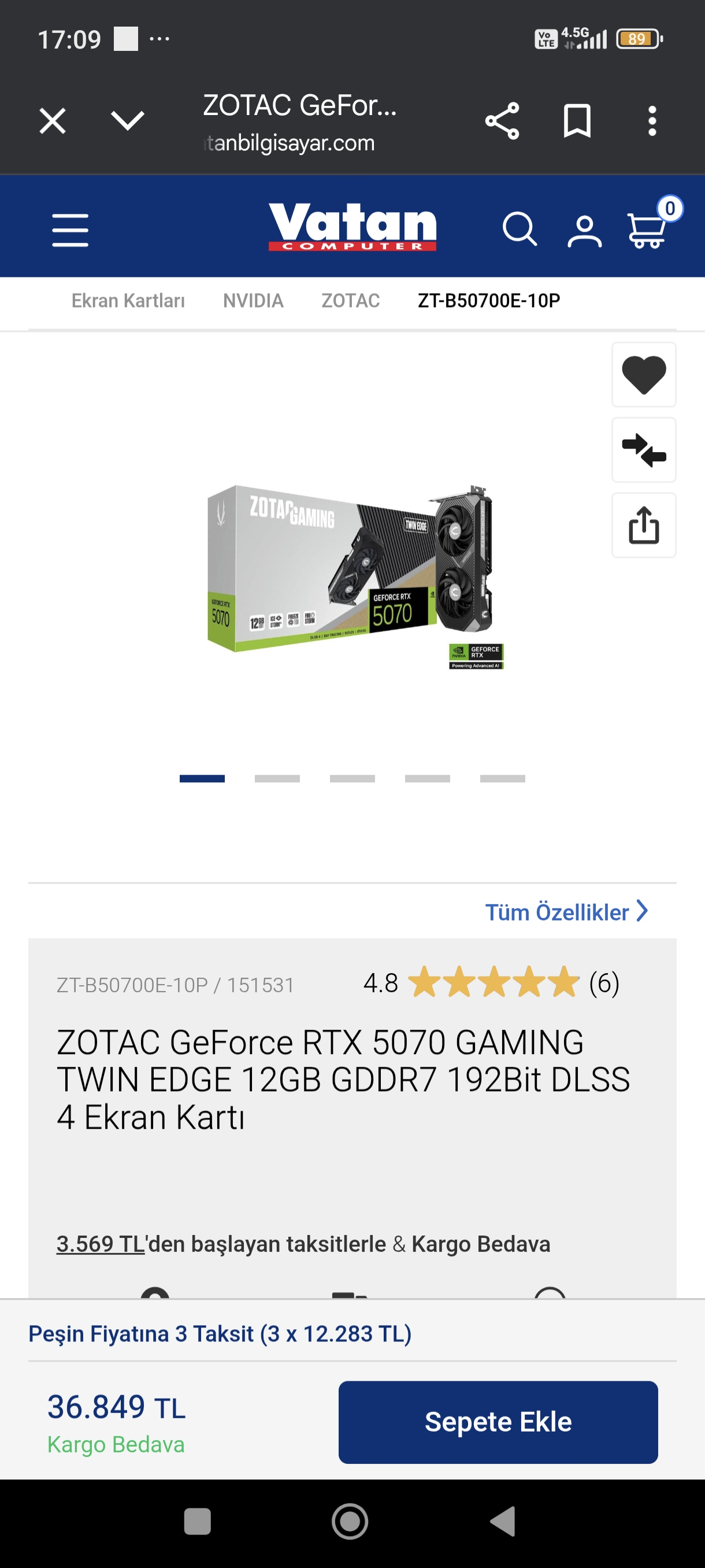 ZOTAC GeForce RTX 5070 GAMING TWIN EDGE 12GB GDDR7 192Bit DLSS 4 Ekran Kartı Sıfır stok 5 adet