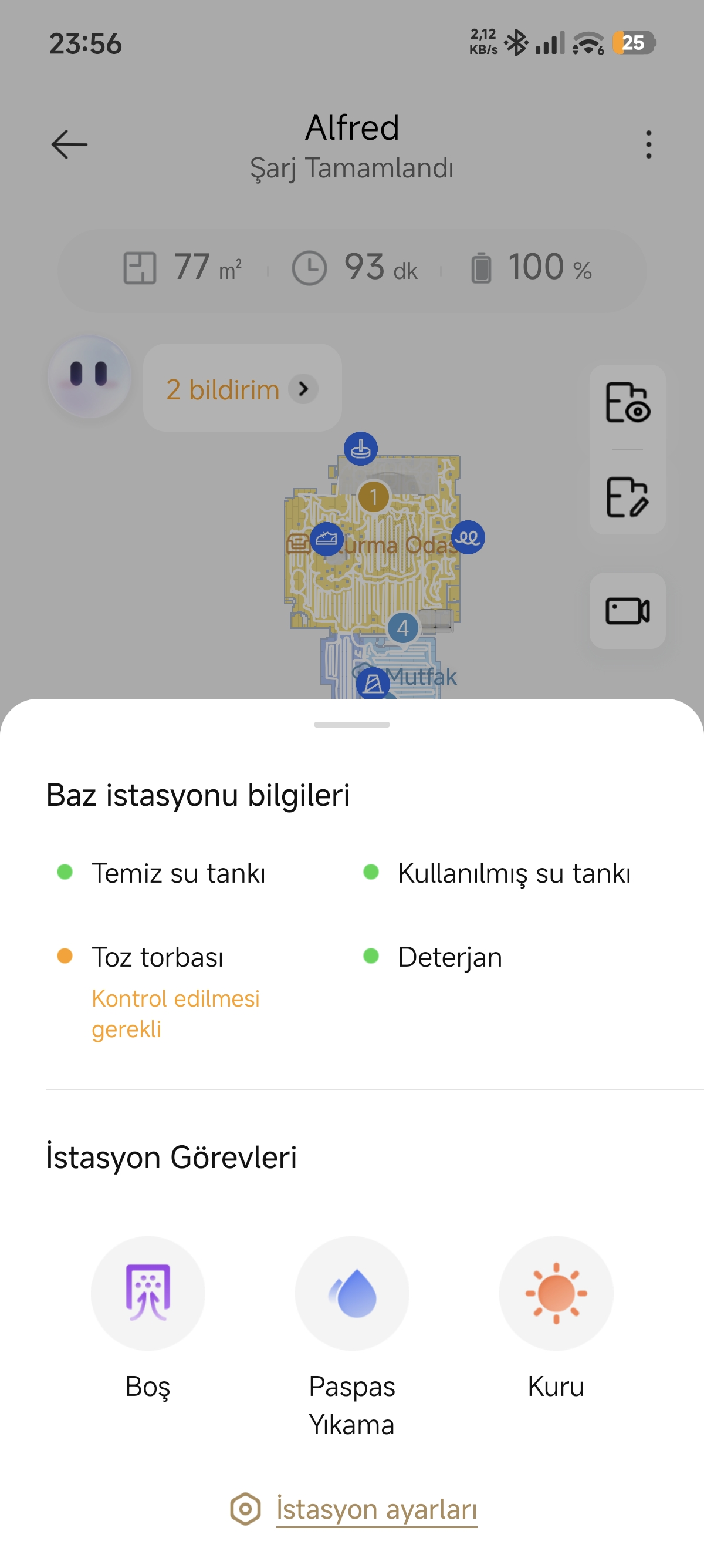 | Yanlış anlamadıysam durumu, daha önce karşılaşmamanıza şaşırdım. Bende daha önce iki defa, ki güncelleme öncesi oldu bunlar, yanaşma ekranına bakmadım ancak doluluk ve kontrol uyarısı mesajı vermişti ki uyarı üzerine değiştirdim toz torbasını. |
