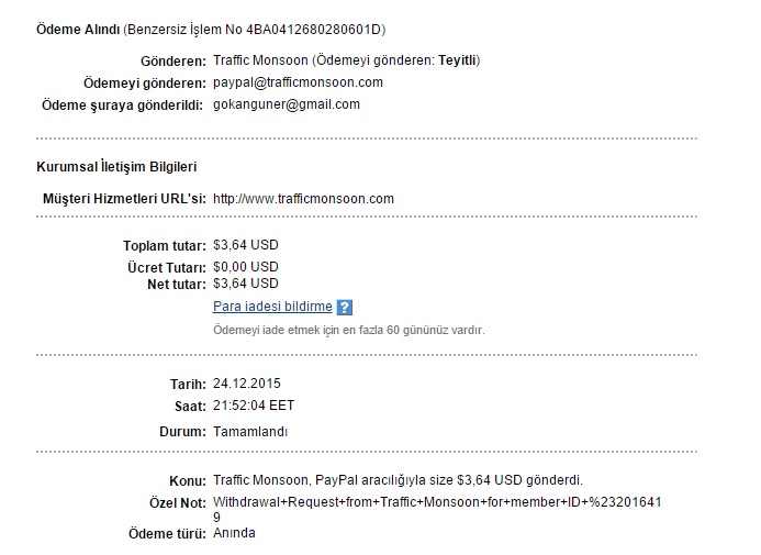 Traffic Monsoon'dan 2'nci ödememi az önce yine 1 dakika içerisinde aldım. Siz de referans linkimle üye olun, kazandığınız her 3 dolar için benden de ekstra 1.5 dolar kazanın. < Resime gitmek için tıklayın > |