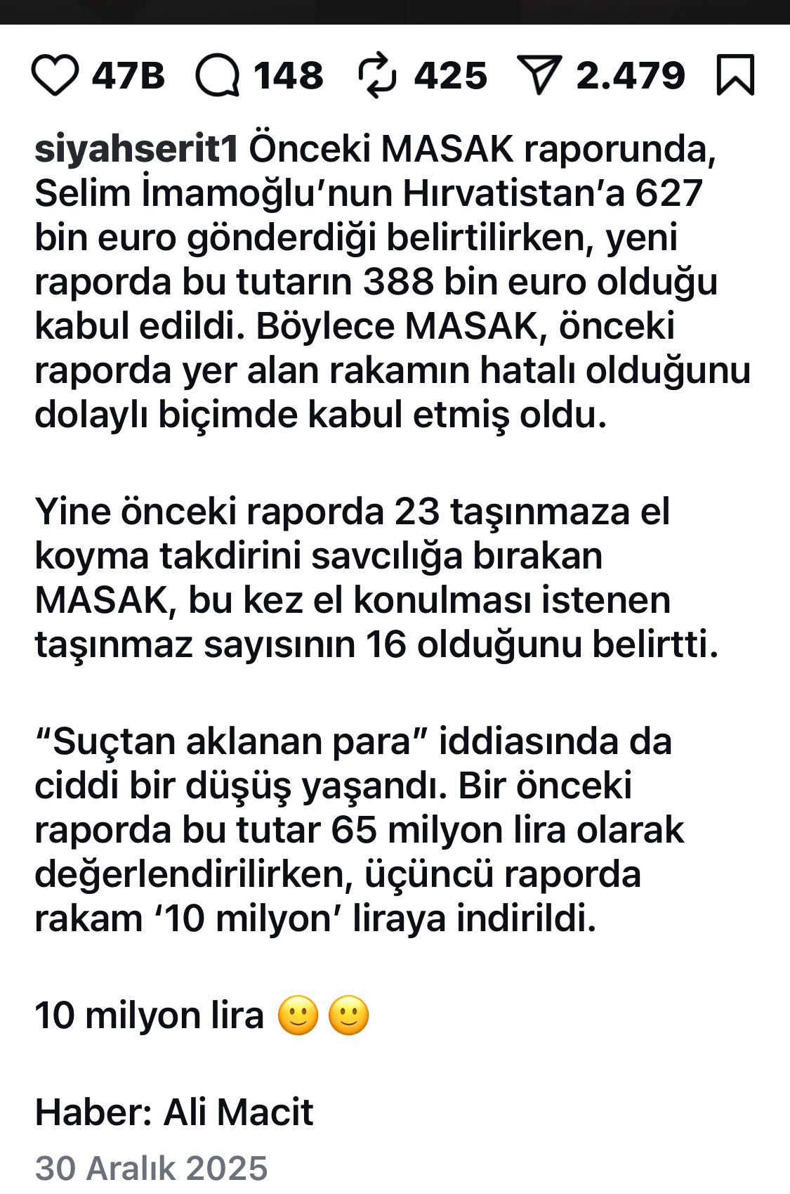 - CHP eski milletvekili arış Yarkadaş: "Ekrem İmamoğlu tutuklanacağına inanmıyordu. İmamoğlu'nun avukatı kendisine soruşturma başladığında tutuklanacağını söyleyince İmamoğlu "Türkiye'de beni tutuklayabilecek bir hakim" yok diyor." "İmamoğlu bu kadar itirafçının olacağını tahmin etmiyordu ve savcının elinde bu kadar bulgunun olduğunuda düşünmüyordu." "CHP'nin İmamoğlu davasını TRT'den canlı yayınlansın teklifini AKP ve MHP red etti. Bence iyide oldu çünkü Ertan Yıldız ve diğer itirafçılar hala ifadelerinin arkasında. Vazgeçen yok.." https://x.com/i/status/1996132434765611233 https://x.com/i/status/1995956910420582481 |