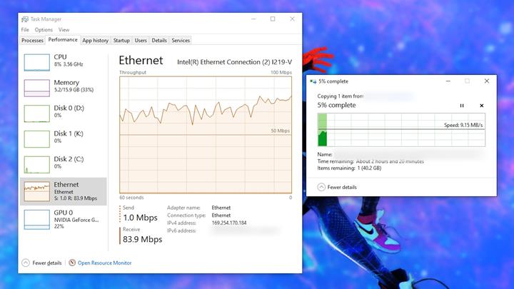 Ben 75 metre/karelik evimin en uç köşelerindeki prizleri kullandım, birinin ucuna QNAP TS-431P sunucumu taktım, diğer ucunu da bilgisayarıma bağladım. Böyle bir senaryoda 70-80Mbit yani 8-9MB/saniye civarı bir hız elde ettim, grafikten de gördüğünüz üzere ani düşüşler yok, oyunlar için bir problem oluşturmaz. Genel olarak hızı büyük dosya paylaşmaya pek uygun değil ama 50/100Mbit’lik bir internet altyapınız vardır, bunun paylaşımı için işinizi görecektir, 4K video akışı için yeterli düzeyinde.