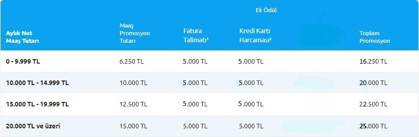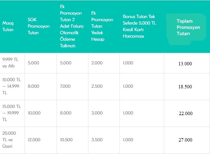 - İlk maaşın müşterinin hesabına gelmesiyle beraber maaş tutarlarına göre koşulsuz 20.000 TL’ye varan nakit promosyon fırsatı!