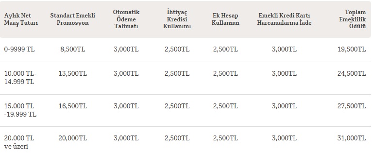 Promosyon tutarı, ödemelerine aracılık edilen tüm emekli maaşlarının 1 aya karşılık gelen tutarı (varsa haciz ve nafaka kesintisi düşülerek) üzerinden hesaplanır ve 3 yıllığına peşin olarak tabloda gösterilen oranlarda ödeme yapılır.