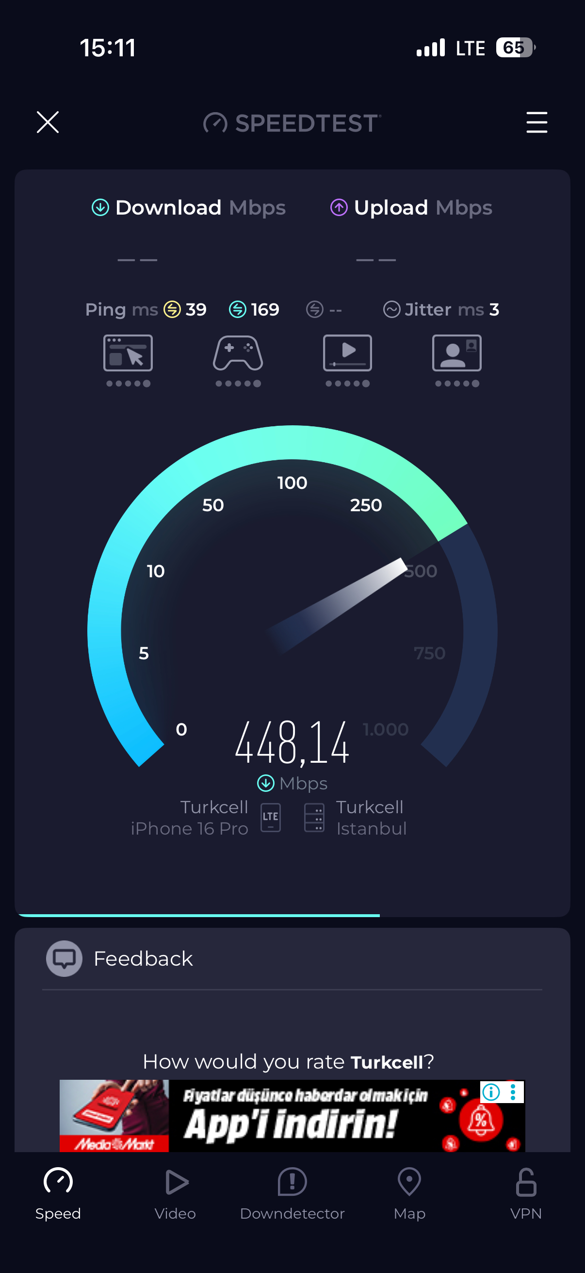 Dışarıda yaptığım hız testi turkcell.