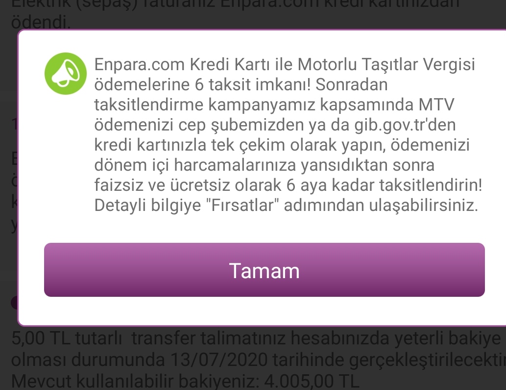 Bildirimler kısmında hocam Edit:Aslında enparanın kullanılma sebeplerinden birisi olan harcama sonrası taksitlendirme olayının kullanımı , ekstra bir kampanya ypk :) |