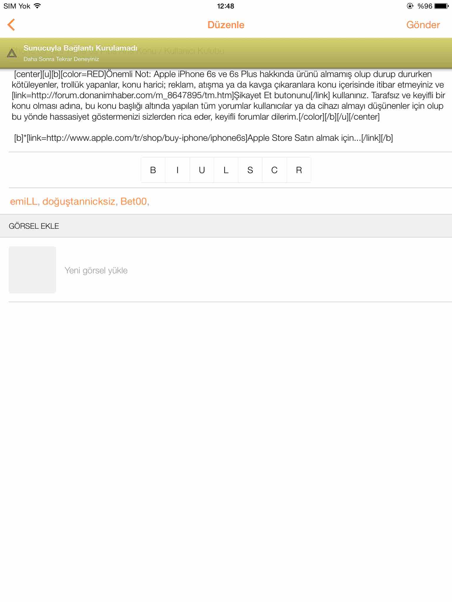 Giriş yapmadan 35. hatanın devam ettini fark ettim. Simage kodu hala çalışmıyor. 20. hata devam ediyor. 46. Giriş yapmadan uygulama ikonunun üzerinde bildirim sayısı gözüküyor. 47. iPhone 6s ve iPhone 6s Plus Ana Konu / Kullanıcı Kulübü konusunda bana ait olan ilk mesajı düzenle dedikten sonra "Gönder" dediğimde Sunucuyla Bağlantı Kurulamadı diyor. 48. Sıcak fırsatlar da (null) yazıyor. 49. Yeni konu açarken yada yorum yaparken "S" harfinin bir fonksiyonu yok çalışmıyor. 50. Yeni Özel Mesaj da "KİME" kısmına 3 kere kendi isminizi yazın, başlık ve içeriğe test yazıp "Gönder" bastığınız an uygulamadan atıyor. Bu şekilde "Gönder" dediğiniz an uygulama kendini kapatıyor. |