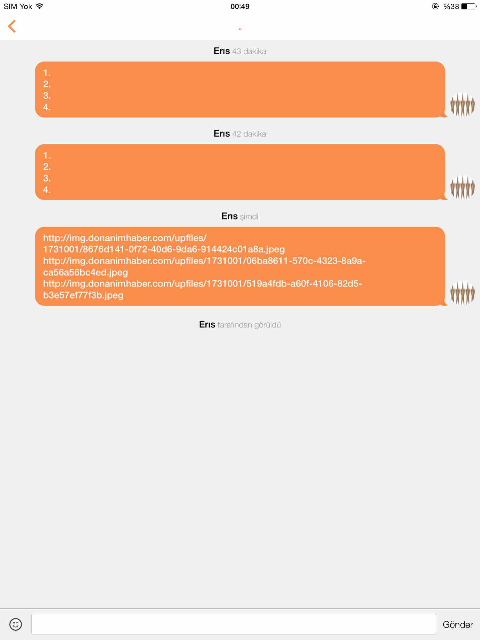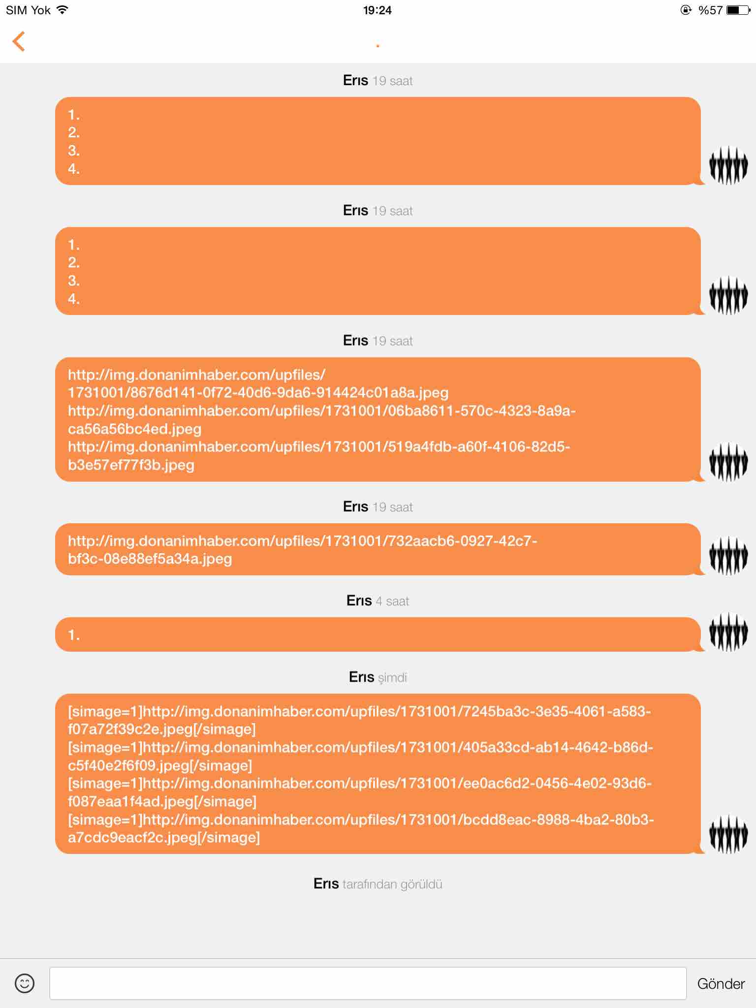 29.Uygulama içerisinde özel mesaj ile gelen youtube linkine tıklandığında videoyu uygulama içerisinde açıyor işin ilginç yanı ses gelmiyor. < Resime gitmek için tıklayın > 30.Uygulama içerisinde karşı tarafa atılan özel mesaj metninde alt satıra seçtiğimde yada boşluk bıraktığımda, karşı tarafa düz metin olarak gidiyor. Bu şekilde atıyorum; < Resime gitmek için tıklayın > Bu şekilde iletiliyor; < Resime gitmek için tıklayın > 31.Özel mesaj da simage kodu ile gönderilen resimler uygulamada link olarak gözüküyor. < Resime gitmek için tıklayın > 32.Uygulama içerisinde "Bildirimler" kısmına gelin; Cihazınızı masanın üstüne bırakın, sağ elinizin işaret parmağını bildirimlerin üzerine, sol elinizin işaret parmağını ise UINavigationBar daki sol kısma bakan ve geriye gelme görevini yapan "<" işaretin üzerine getirin, şimdi hızlı bir şekilde sağ elinizin işaret parmağı ile herhangi bir bildirime girdin aynı anda sol elinizin işaret parmağı ile girdiğiniz bildirimden çıkın. Bildirim ekranında gördüğünüz ilk 3-4 bildirime sağ elinizin işaret parmağı ile tıklayın aynı anda sol elinizin işaret parmağı ile de "<" geri gelin. Bu işlemi hızlı hızlı yapın ve son olarak bir bildirime tıklayın ve bırakın. Sayfanın açılması bekleniyor "sunucu ile bağlantı kurulamadı" diyor uygulamadan atıyor. Bazen atıyor bazen atmıyor atmaz ise uygulamayı kapatın tekrar açın bildirimler ekranına gelin ve ilk 2-3 bildirimde hızlı bir şekilde uygulayın. Aynı olayı profil kısmında da gözlemledim; Profilinize gelin yorum yaptığınız ilk 3 konu "son aktiviteler" kısmında gözüküyor, Sırayla bu konulara hızlı bir şekilde arka arkaya girin ve çıkın son olarak konuya girin ve bırakın uygulama kendini kapatıyor. |