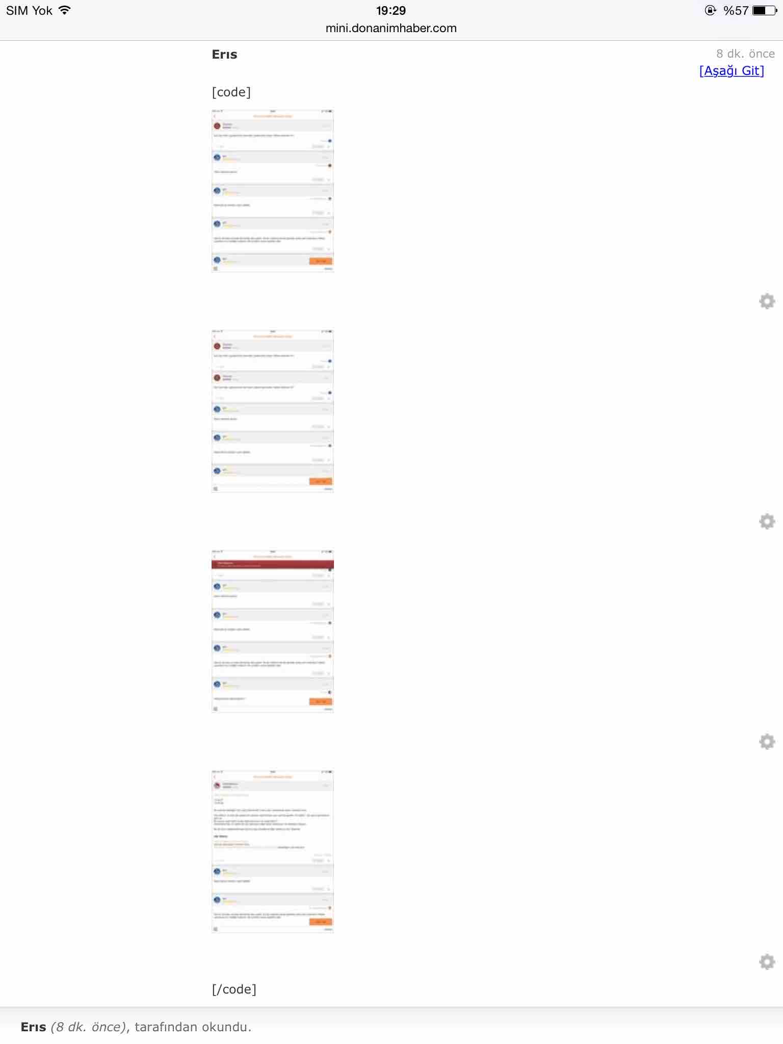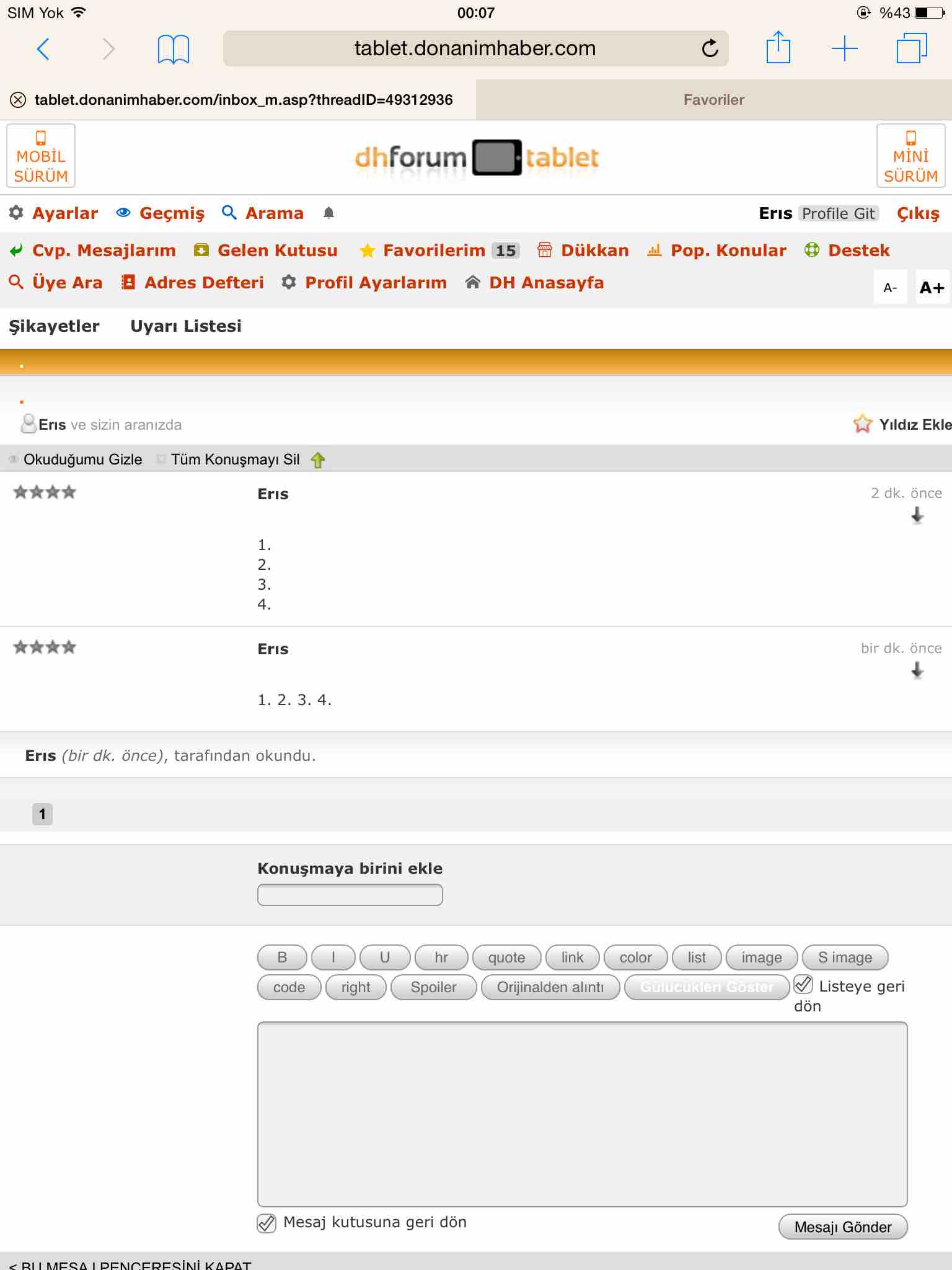 33."Yorum Yap" kısmında "GÖRSEL EKLE" dediğimizde galeriden tek görsel seçebiliyoruz, birden fazla görsel seçilse daha iyi olur. 34.Özel mesaj da "code--/code" kodu ile gönderdiğim "simage" kodlu resim uygulamada simage kodu ile çıkıyor, fakat tablet veya mini sürümde bakıldığında "code--/code" kodu çalışmıyor. Uygulamada bu şekilde... Tarayıcıda bu şekilde... 35.Arka arkaya cevapladığınız yada alıntıladığınız mesajlarda hangi mesajı alıntıladınız yada cevapladınız ona bakmak istediğimde mümkün olmuyor bir algoritma hatası mevcut. Biraz önce yazdığınız Foruma özellik katanlara rütbe konusuna uygulamadan girin ve < Resime gitmek için tıklayın > bu mesajlarınızın olduğu yere gidin, burada siyah kare içerisine aldığım yerlere tıklayın; "Ömürcan" tıkladığınızda hemen üstte ki "Ömürcan"ın mesajı tekrar açılıyor. "ChaRisMaTiq1i" tıkladığınızda "İşlem başarısız" hatası veriyor. "ChaRisMaTiq1i" tekrar tıkladığınızda işlem yapmıyor. "XpressMusic34" tıkladığınızda bir önce ki "ChaRisMaTiq1i"in mesajını açıyor. "XpressMusic34" tekrar tıkladığınızda "XpressMusic34"in mesajını açıyor yada işlem yapmıyor (1 denememde açtı 2. denememde işlem yapmadı.) "Lion" tıkladığınızda "Lion" mesajını açıyor fakat, "_ahmet_" tıkladığınızda "İşlem başarısız" diyor ve "_ahmet_"in mesajını açmıyor. |