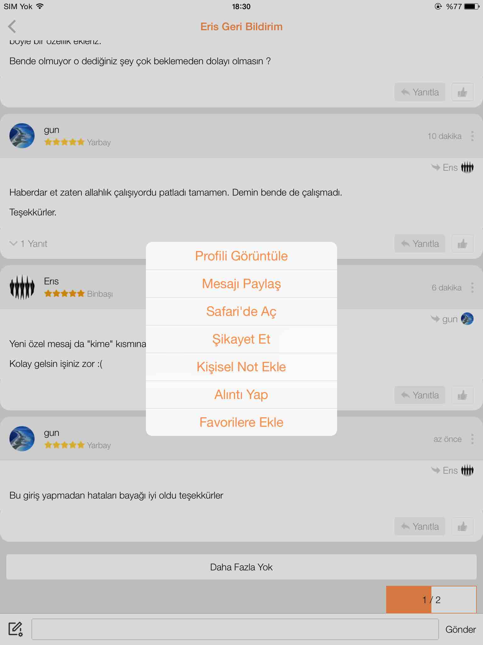 36.Hatırlıyor iseniz uzun süre önce bir istek de bulunmuştum. :) 1100 yakın konuyu favoriye aldım ve daha da artıyor. "Favorilerim" kısmında arama özelliği olabilir mi? demiştim. Favori konu ve favori yorumlar da uygulamanın arama bölümünde yer alabilir. Bir kelime yazdığımda favori konularımda arama yapabilir ise favoriye aldığım konuya ulaşmam daha hızlı olabilir. < Resime gitmek için tıklayın > 37.Özel mesaj bildirimlerine, iOS mesaj bildirimleri gibi "Yanıtla" seçeneği yapılabilir. Bu şekilde... 38.Uygulamada "Daha Fazla" > "Kişisel Notlarım" > burada not aldığım kişi üzerinde parmağınızı sol'a kaydırdığınızda sadece "Sil" seçeneği çıkıyor, parmağımızı sağ"a kaydırdığımızda "Notu Düzenle" seçeneği olabilir. 39.Uygulama içerisinde "Daha Fazla" kısmında "Ön Belleği Temizle" seçeneği koyulabilir. 40.Gizlilik durumunda "Gezdiğim Konuları Kaydetme" seçeneği aktif olmasına rağmen uygulamada "Daha Fazla" > "Gezdiklerim" kısmında gezdiğim konuları gösteriyor. |
