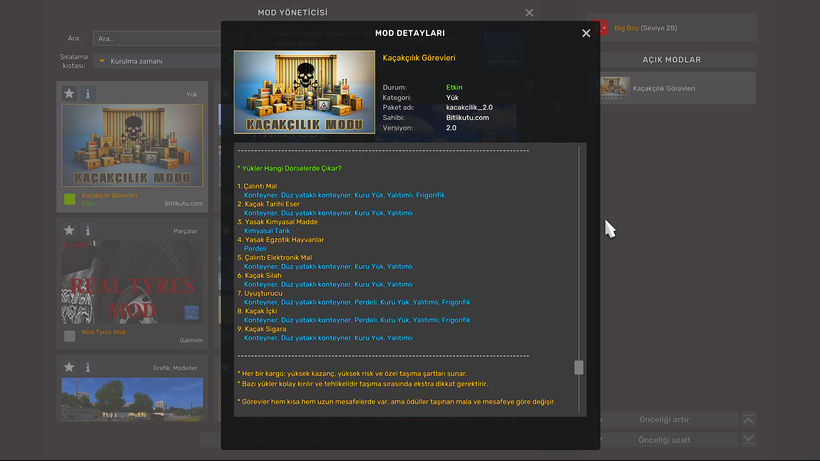 Sol taraftaki listeden "Kaçakçılık Görevleri" modunu bulun ve üzerine çift tıklayarak sağ taraftaki "Aktif Modlar" listesine geçirin.