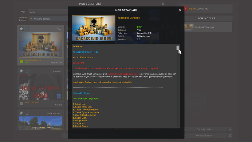 Euro Truck Simulator 2'nin yollarında standart yükleri taşımak bir süre sonra rutine binebilir. Eğer siz de oyununuza biraz daha risk, heyecan ve tabii ki daha yüksek kazanç katmak istiyorsanız, Kaçakçılık Görevleri Modu v2.0 tam size göre.