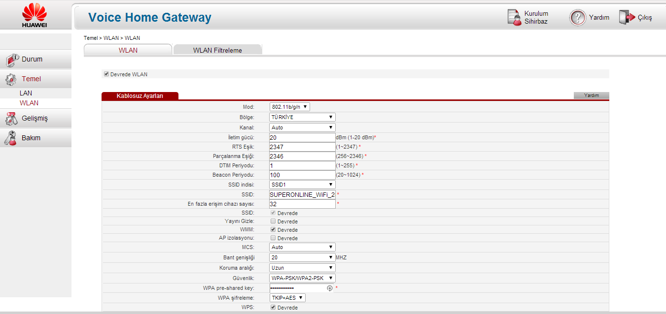 Huaweinin arayuzundeki WLAN bolumunu resim olarak ekledim. < Resime gitmek için tıklayın > |