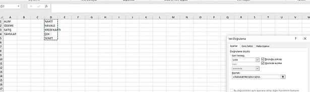 Ödeme şekli için de Veri doğrulama yapıyoruz.