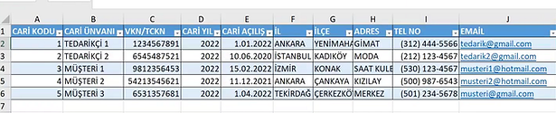 Örnek olması açısından 5 adet Cari bilgileri giriyoruz.